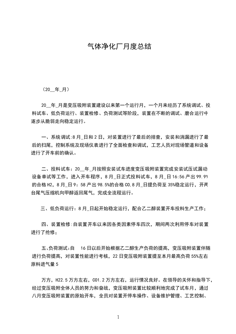 20__年_月是变压吸附装置建设以来第一个运行月,一个月来经历了系统调试、投料试车、低负荷运行、装置检修、负荷测试等阶段,装置在不断的调试、磨合运行中逐步从脆弱走向稳定运行。