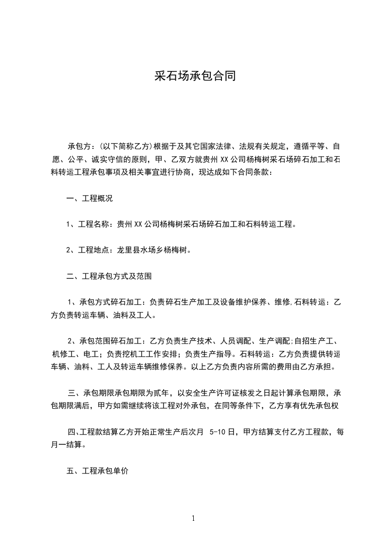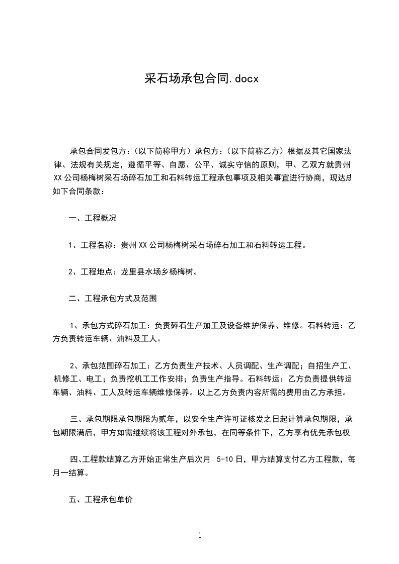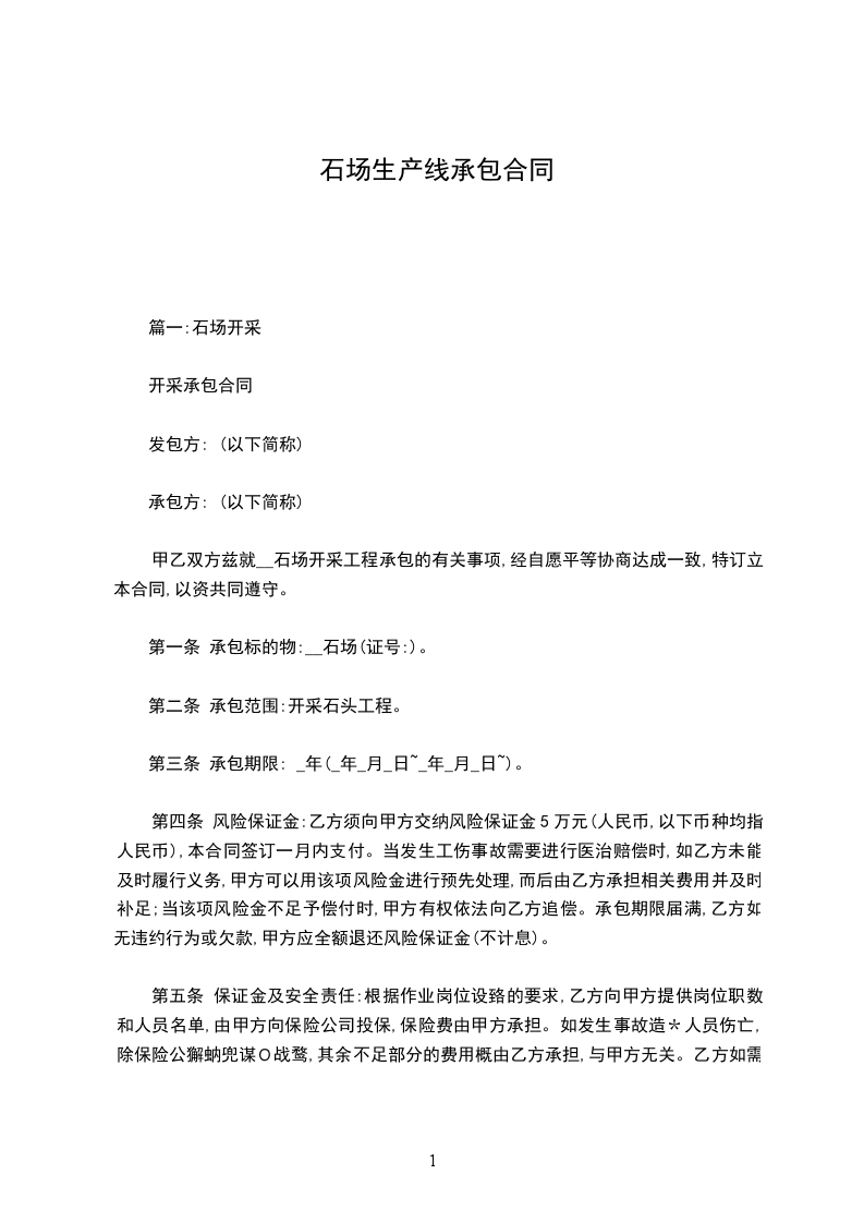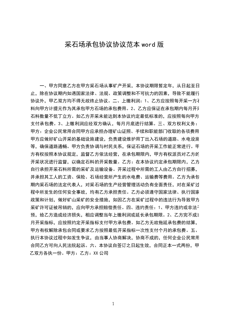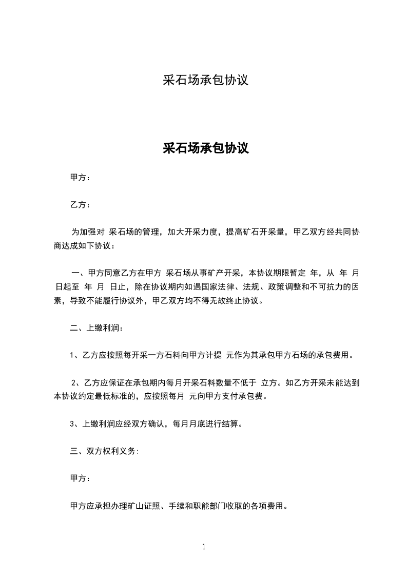 一、甲方同意乙方在甲方 采石场从事矿产开采,本协议期限暂定 年,从 年 月 日起至 年 月 日止,除在协议期内如遇国家法律、法规、政策调整和不可抗力的因素,导致不能履行协议外,甲乙双方均不得无故终止协议。