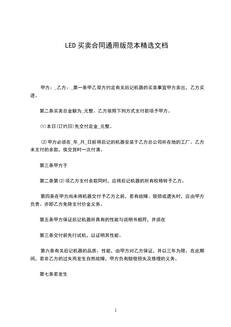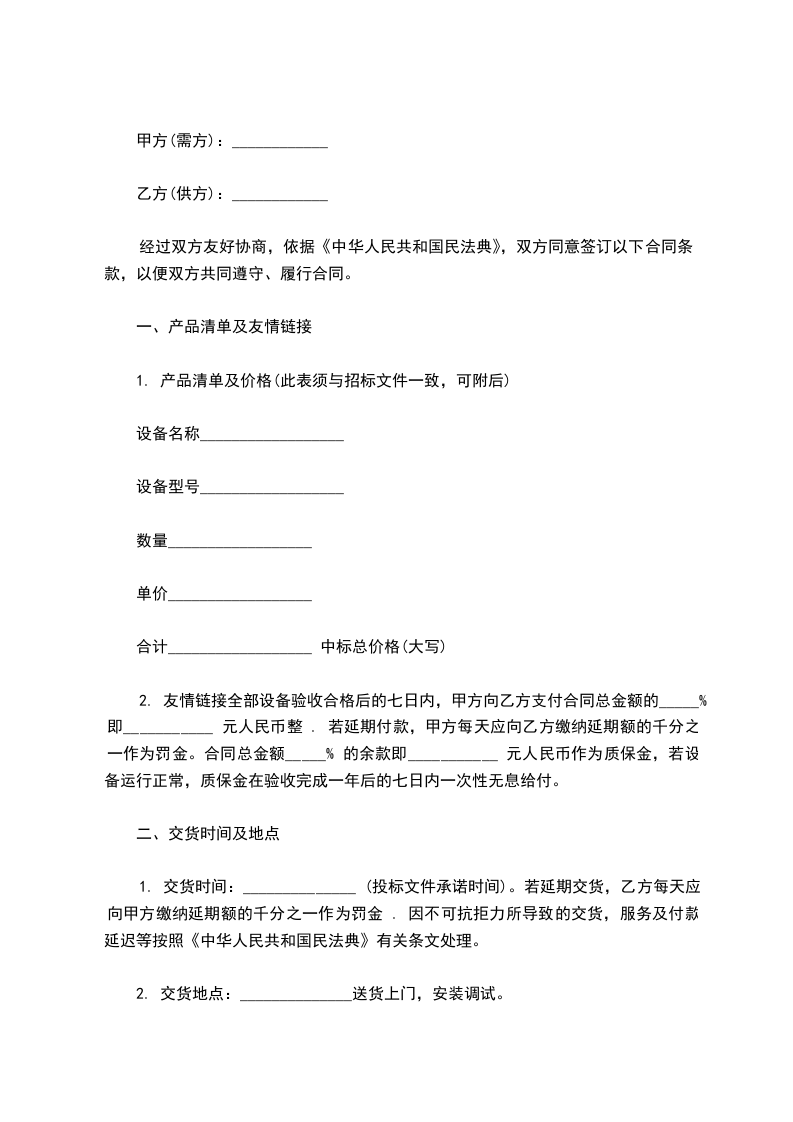 1. 交货时间:______________ (投标文件承诺时间)。若延期交货,乙方每天应向甲方缴纳延期额的千分之一作为罚金 . 因不可抗拒力所导致的交货,服务及付款延迟等按照《中华人民共和国民法典》有关条文处理。
