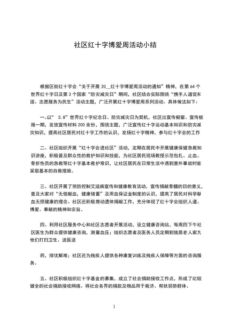 根据区街红十字会“关于开展20__红十字博爱周活动的通知”精神,在第64个世界红十字日及第3个国家“防灾减灾日”期间,社区结合实际围绕“携手人道促和谐、志愿服务为民生”活动主题,广泛开展红十字博爱周系列活动。具体做法如下: