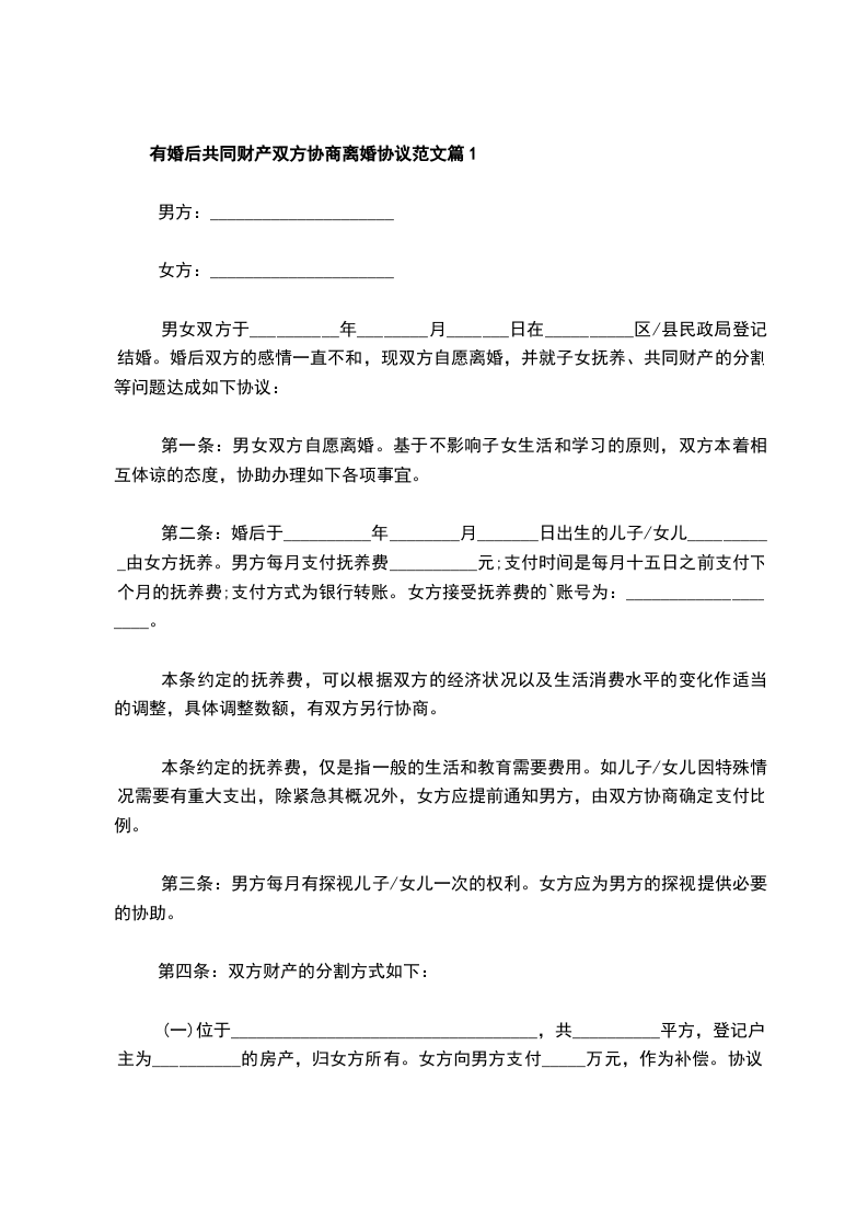 第一条:男女双方自愿离婚。基于不影响子女生活和学习的原则,双方本着相互体谅的态度,协助办理如下各项事宜。