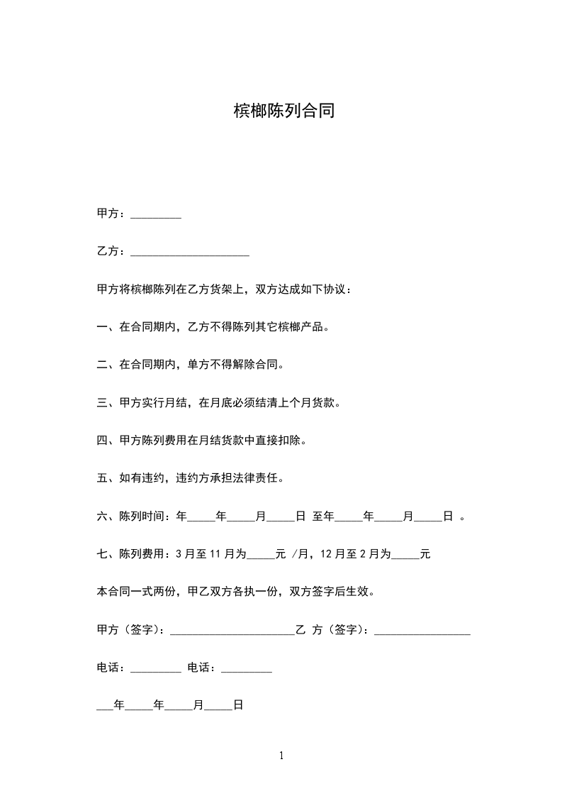 一、在合同期内,乙方不得陈列其它槟榔产品。