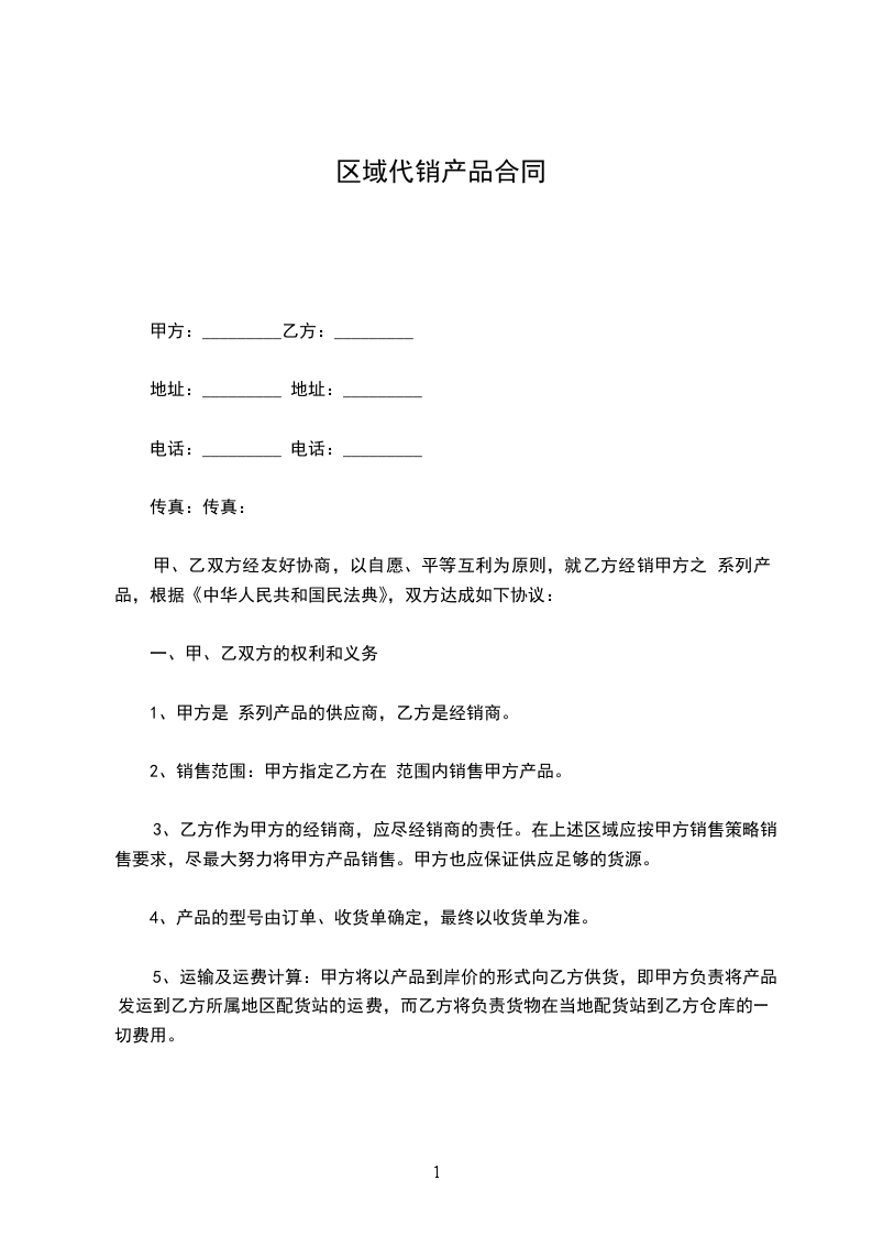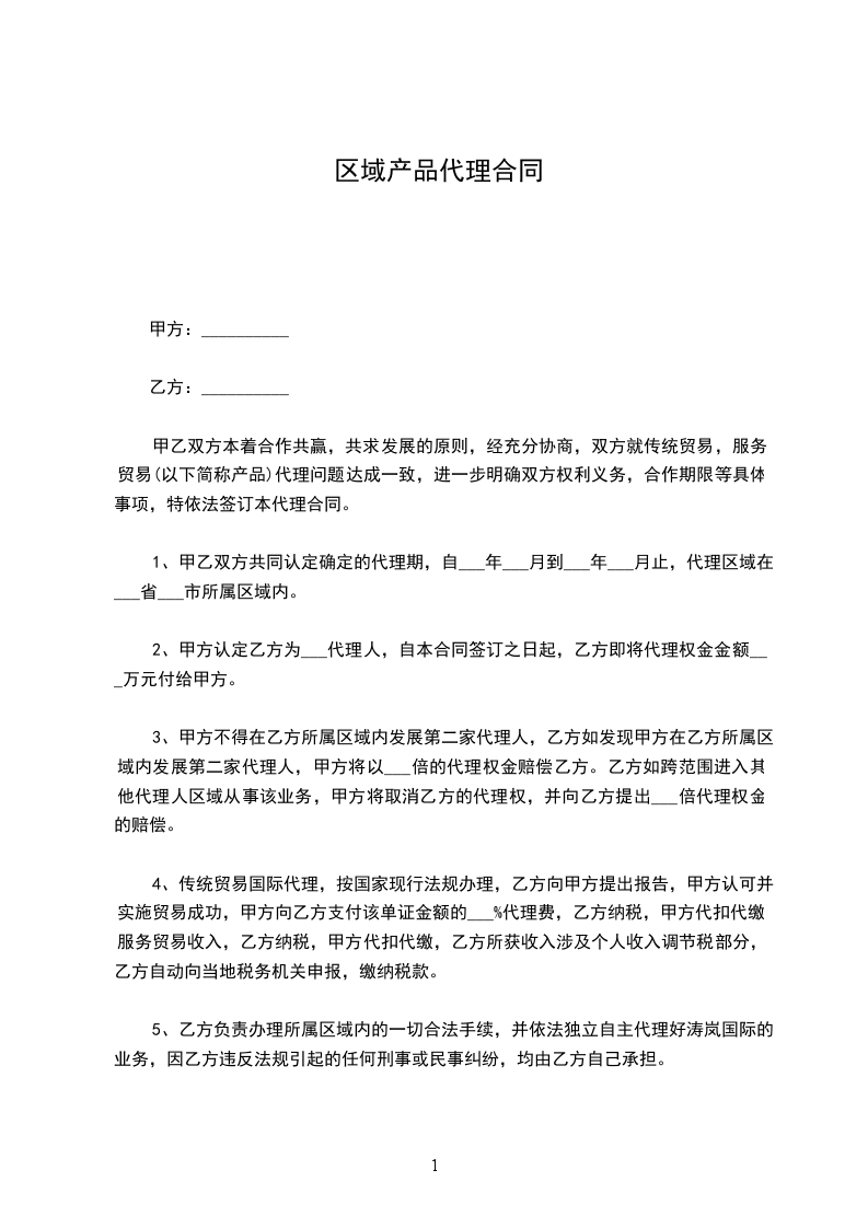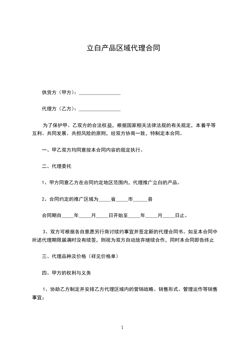 1、甲方同意乙方在合同约定地区范围内,代理推广立白的产品。