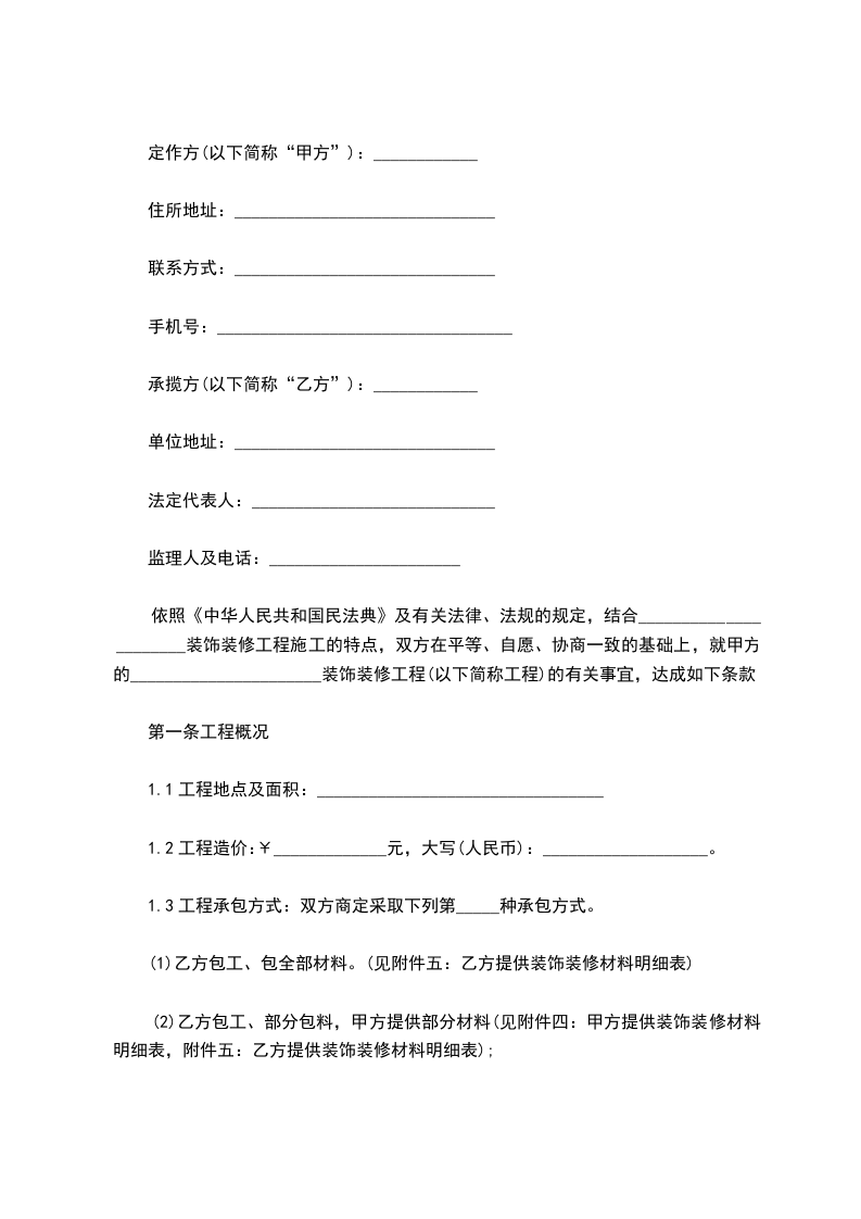 依照《中华人民共和国民法典》及有关法律、法规的规定,结合______________________装饰装修工程施工的特点,双方在平等、自愿、协商一致的基础上,就甲方的______________________装饰装修工程(以下简称工程)的有关事宜,达成如下条款: