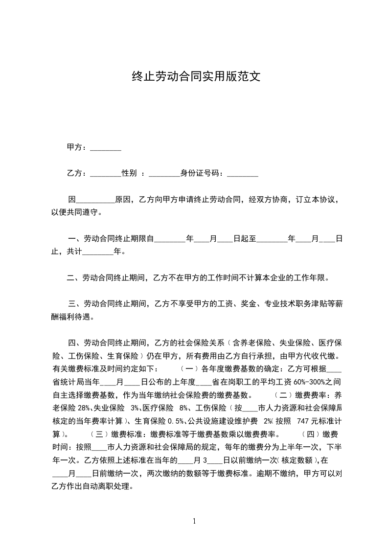 四、劳动合同终止期间,乙方的社会保险关系﹙含养老保险、失业保险、医疗保险、工伤保险、生育保险﹚仍在甲方,所有费用由乙方自行承担,由甲方代收代缴。有关缴费标准及时间约定如下: ﹙一﹚各年度缴费基数的确定:乙方可根据____省统计局当年____月____日公布的上年度____省在岗职工的平均工资60%-300%之间自主选择缴费基数,作为当年缴纳社会保险费的缴费基数。 ﹙二﹚缴费费率:养老保险28%、失业保险3%、医疗保险8%、工伤保险﹙按____市人力资源和社会保障局核定的当年费率计算﹚、生育保险0.5%、公共设施建设维护费2%﹙按照747元标准计算﹚。 ﹙三﹚缴费标准:缴费标准等于缴费基数乘以缴费费率。 ﹙四﹚缴费时间:按照____市人力资源和社会保障局的规定,每年的缴费分为上半年一次,下半年一次。乙方依照上述标准在当年的____月3____日以前缴纳一次﹙核定数额﹚,在1____月____日前缴纳一次,两次缴纳的数额等于缴费标准。逾期不缴纳,甲方可以对乙方作出自动离职处理。