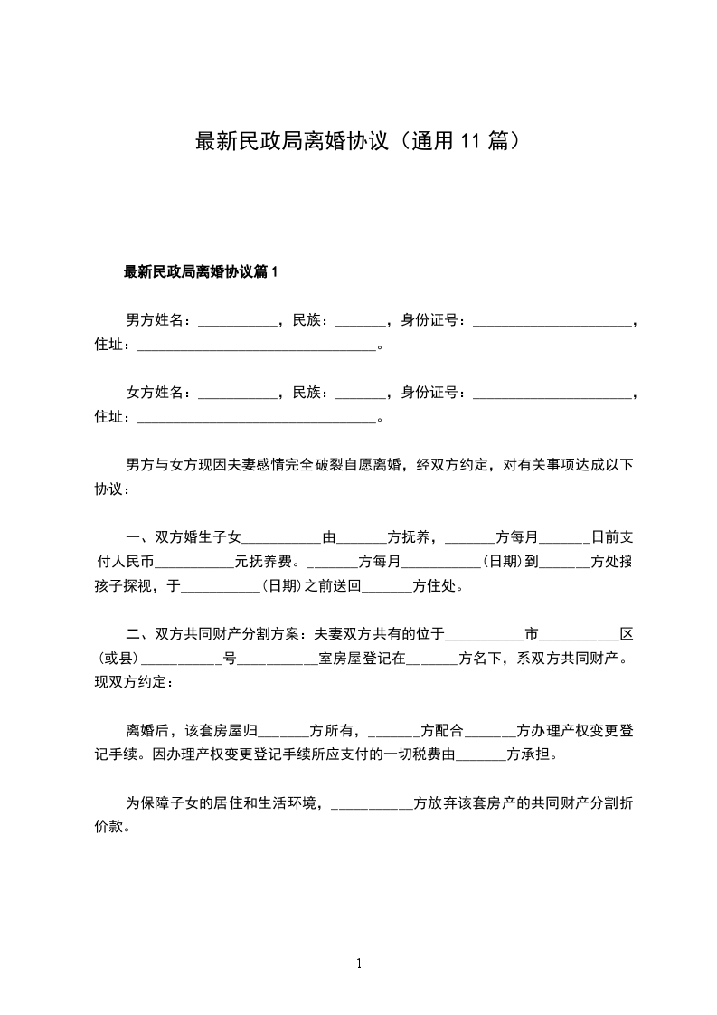 最新民政局常用离婚协议篇11
