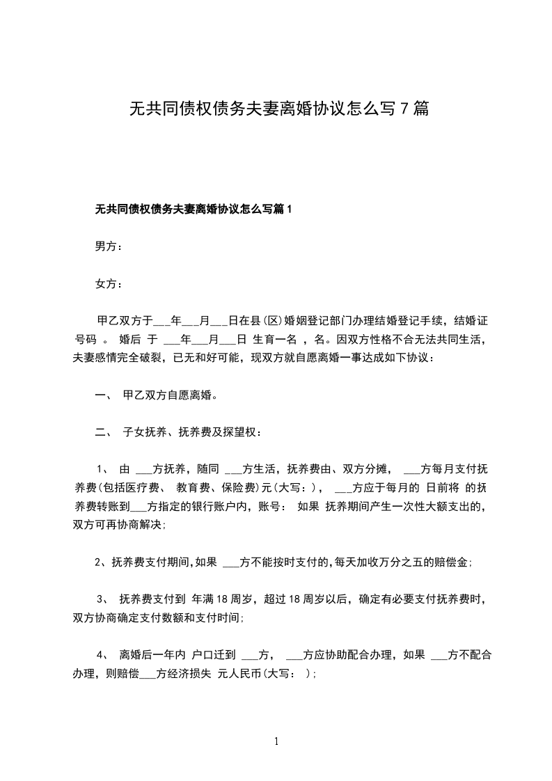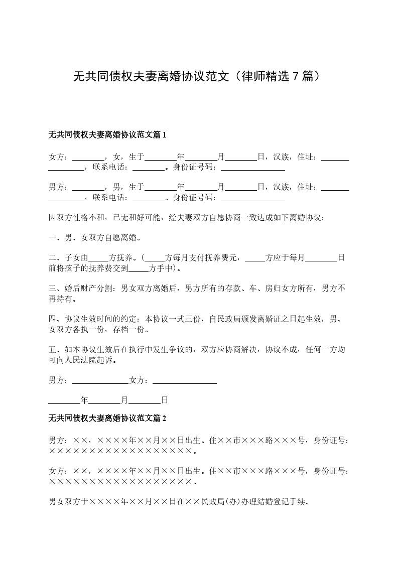 无共同债权夫妻离婚协议范文篇7