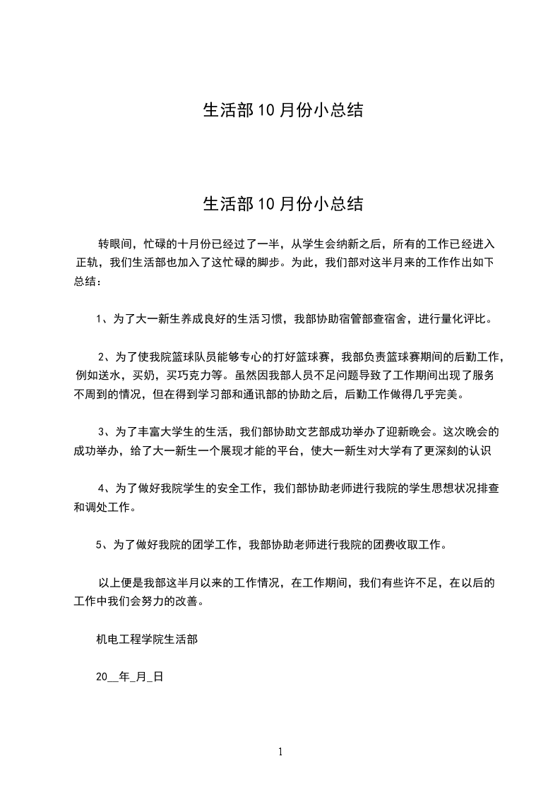 盛世扬帆,只争朝夕。时光流水般,一个月时间眨眼即逝,在过去的一个月中,本届生活部的工作在有条不紧的进行。生活部本着“为老师分忧,为同学服务”的工作宗旨,在领导和老师的关怀和指导下,在同学们的大力支持和鼎力协助下,已取得了一定的工作成果,并得到了同学们的好评。我生活部也为院里生活卫生工作做了一定的努力,具体总结如下: