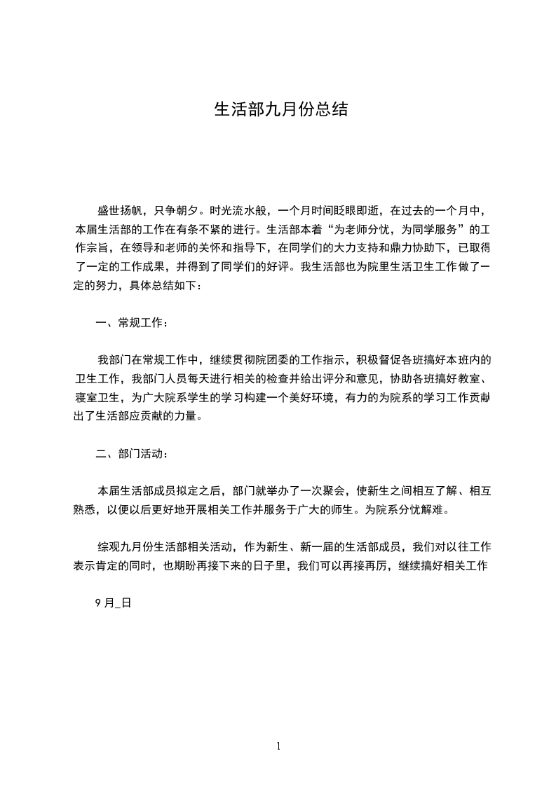 综观九月份生活部相关活动,作为新生、新一届的生活部成员,我们对以往工作表示肯定的同时,也期盼再接下来的日子里,我们可以再接再厉,继续搞好相关工作。