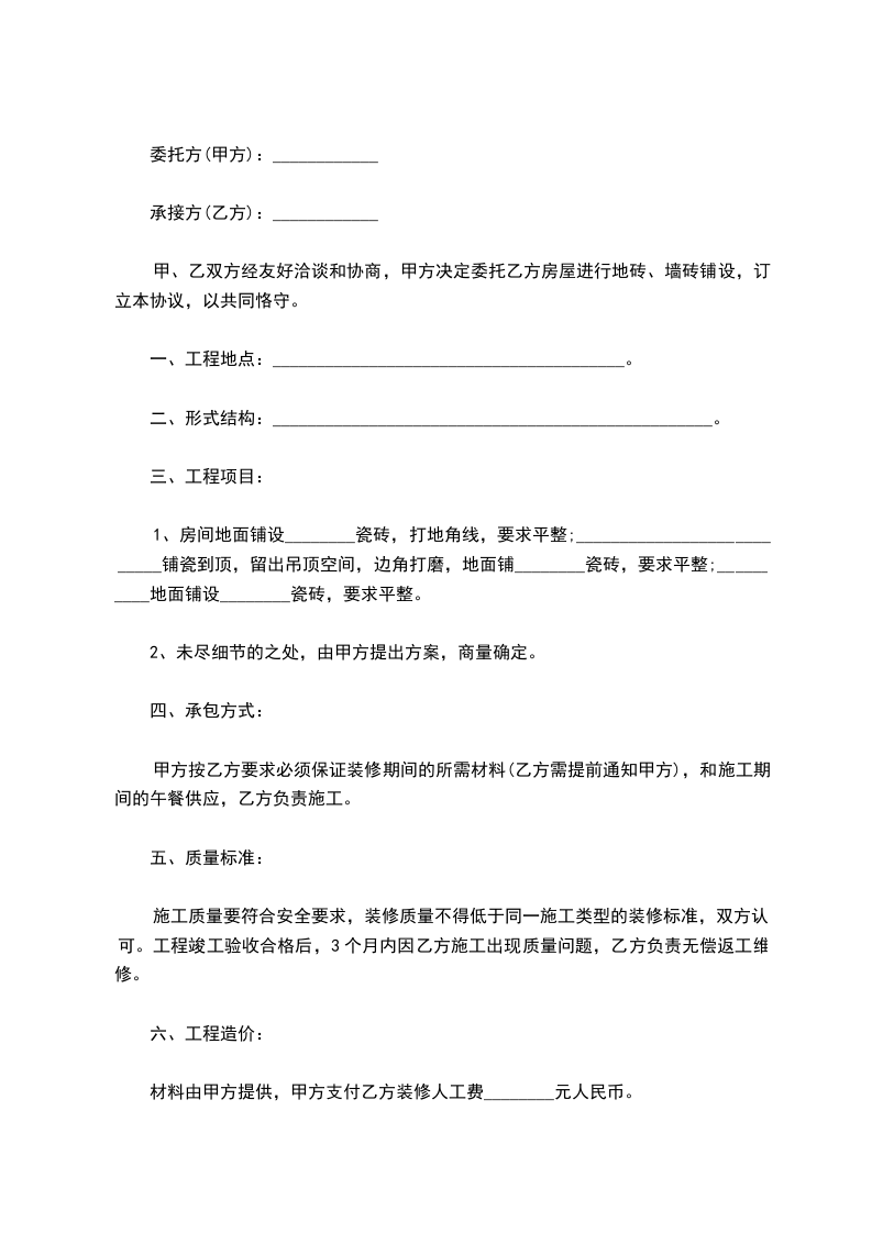 甲、乙双方经友好洽谈和协商,甲方决定委托乙方房屋进行地砖、墙砖铺设,订立本协议,以共同恪守。