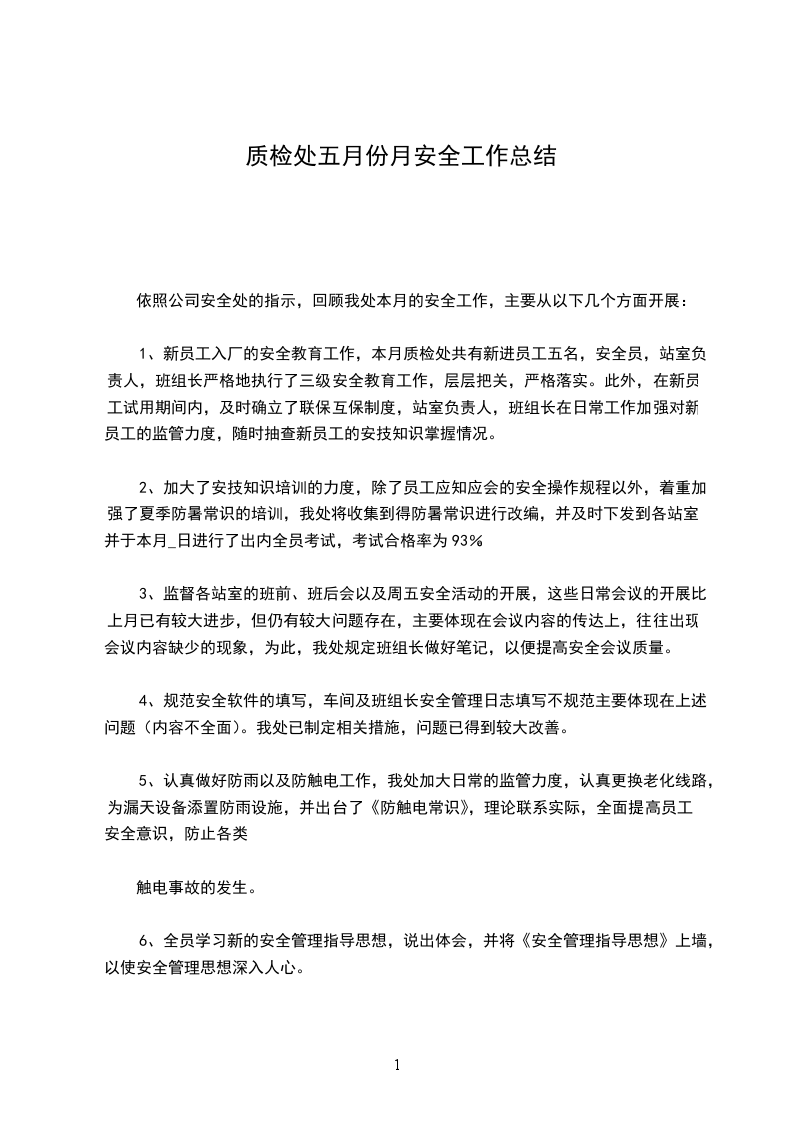 1、新员工入厂的安全教育工作,本月质检处共有新进员工五名,安全员,站室负责人,班组长严格地执行了三级安全教育工作,层层把关,严格落实。此外,在新员工试用期间内,及时确立了联保互保制度,站室负责人,班组长在日常工作加强对新员工的监管力度,随时抽查新员工的安技知识掌握情况。