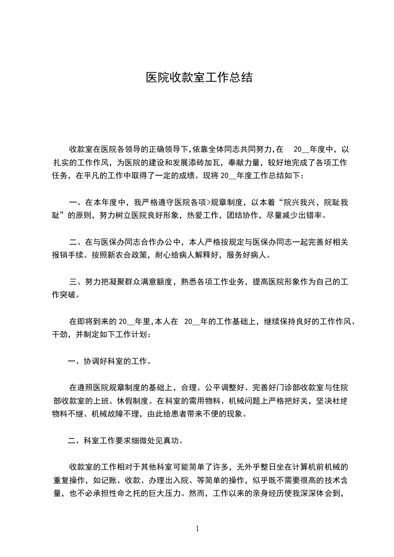 收款室在医院各领导的正确领导下,依靠全体同志共同努力,在20__年度中,以扎实的工作作风,为医院的建设和发展添砖加瓦,奉献力量,较好地完成了各项工作任务,在平凡的工作中取得了一定的成绩。现将20__年度工作总结如下: