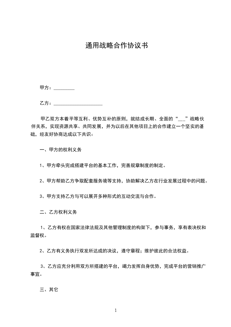 甲乙双方本着平等互利、优势互补的原则,就结成长期、全面的“___”战略伙伴关系,实现资源共享、共同发展,并为以后在其他项目上的合作建立一个坚实的基础,经友好协商达成以下共识:
