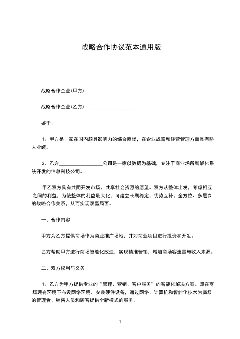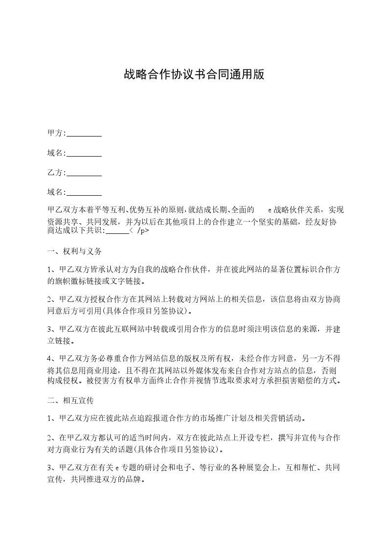 1、甲乙双方皆承认对方为自己的战略合作伙伴。