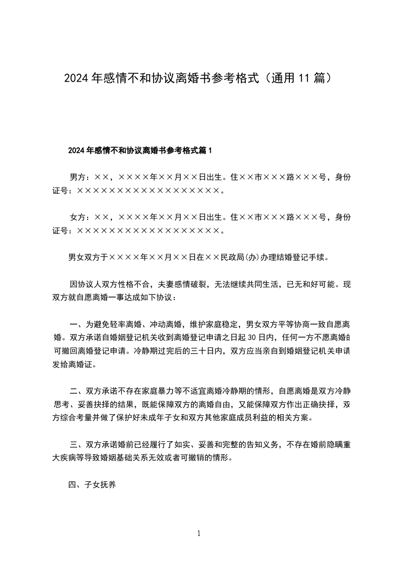 2024年感情不和协议离婚书参考格式篇1