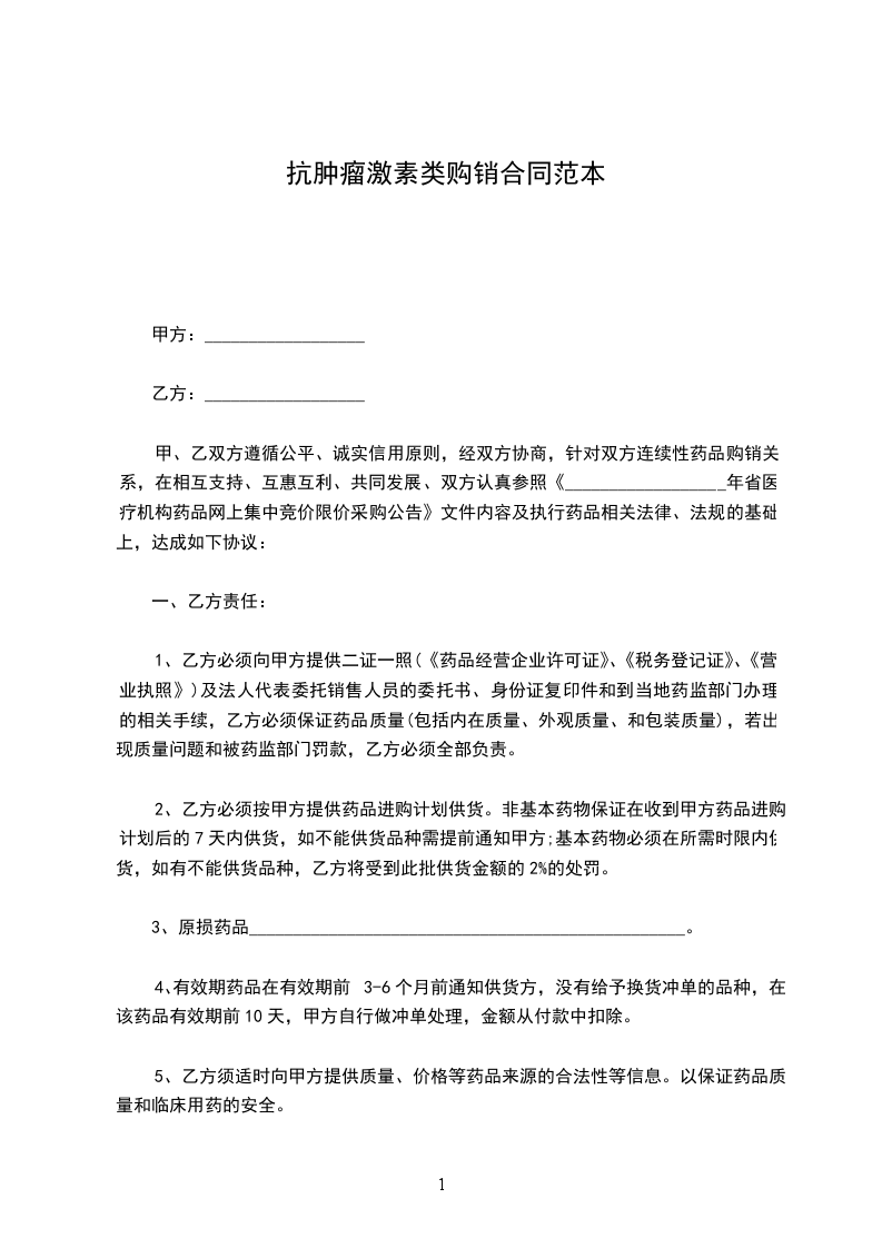 根据《中华人民共和国民法典》,甲、乙双方经协商确定,甲方向乙方购买药品。为明确双方责任和权利,特签订本合同,共同遵守。具体条款如下: