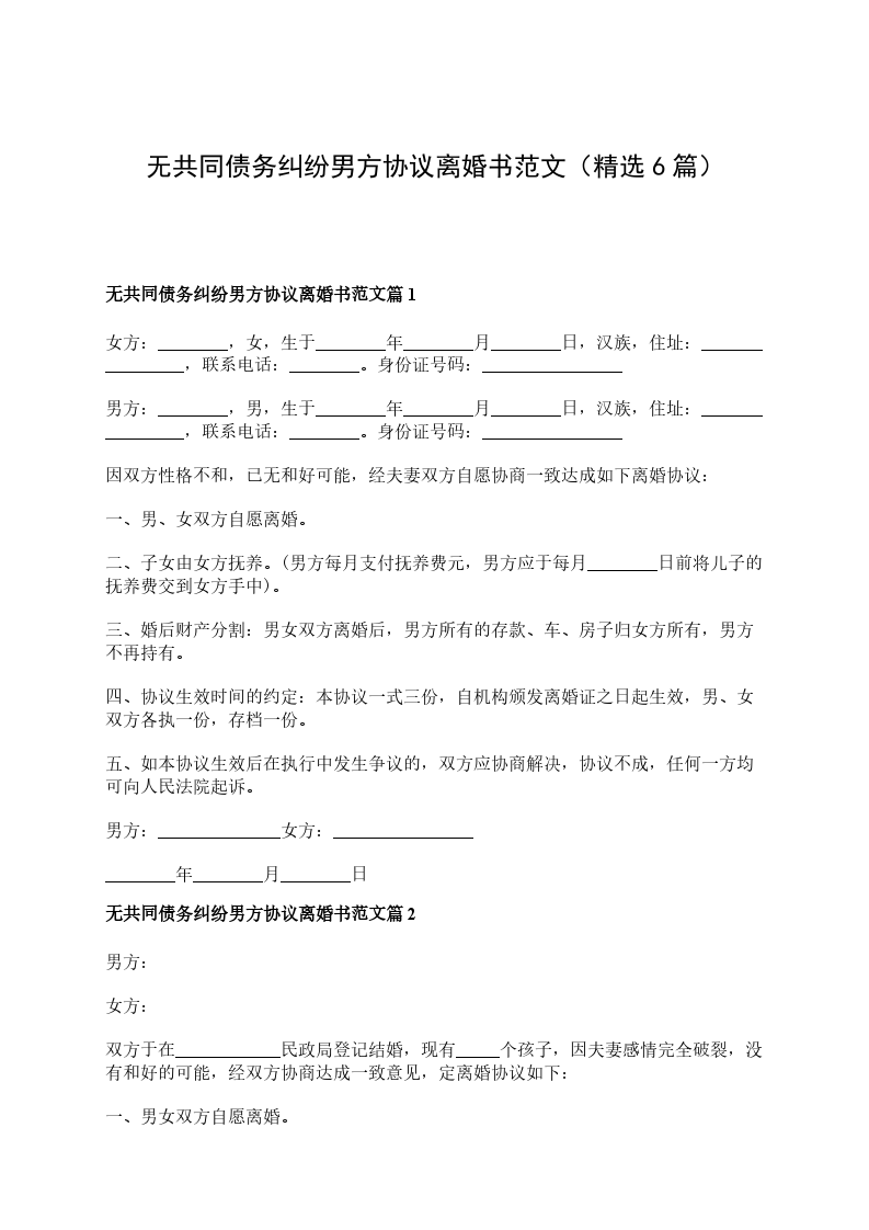无共同债务纠纷男方协议离婚书范文篇6
