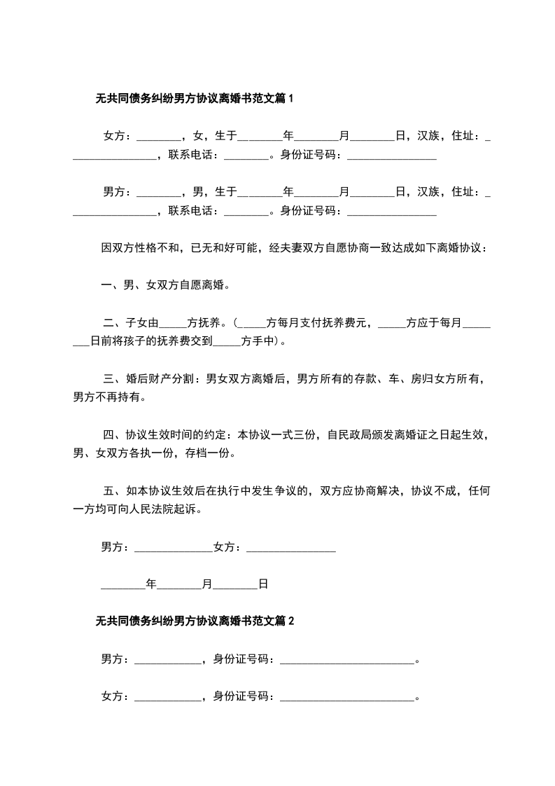 无共同债务纠纷男方协议离婚书范文篇5