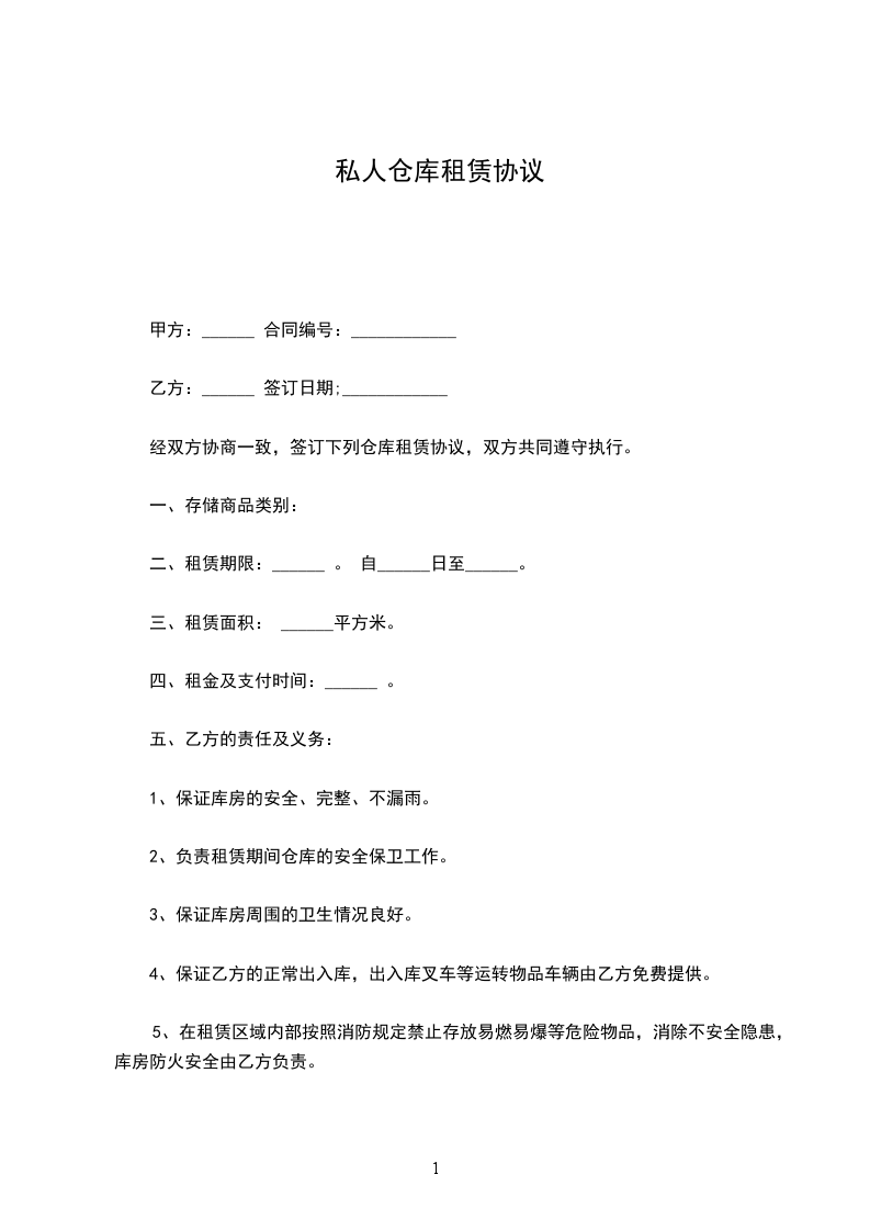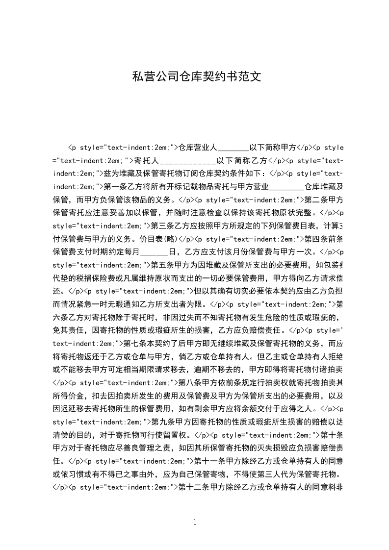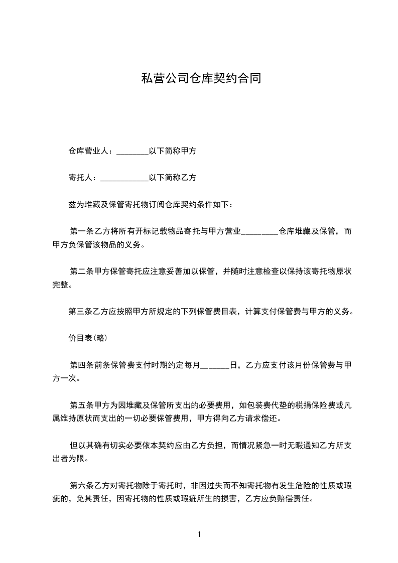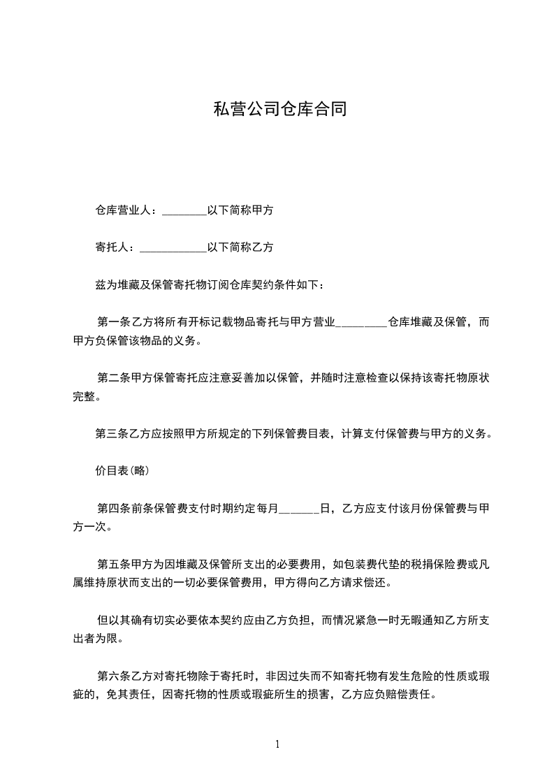 第一条乙方将所有开标记载物品寄托与甲方营业_________仓库堆藏及保管,而甲方负保管该物品的义务。