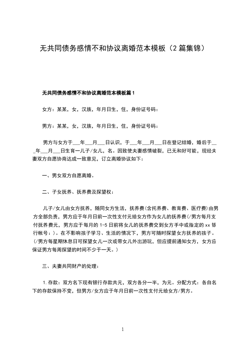 无共同债务感情不和协议离婚范本模板篇1