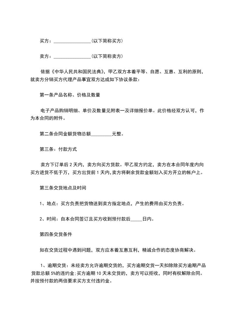 5、如需方未按照本合同第六条规定的时间送货、送货迟延或货物的数量与合同约定不符,应赔偿供方违约金__________元。
