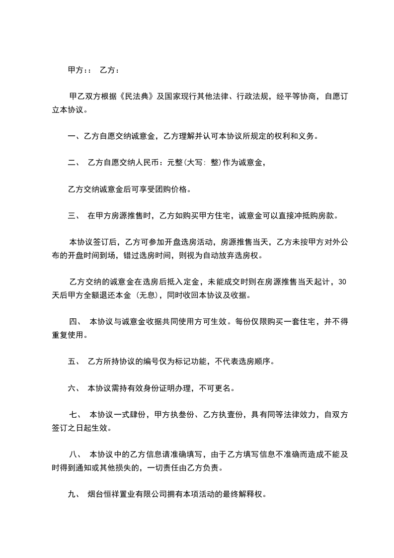 第二条、乙方充分了解所预定房源的相关情况后,并自愿交纳诚意金小写