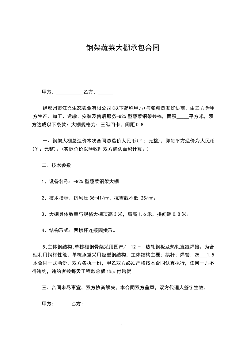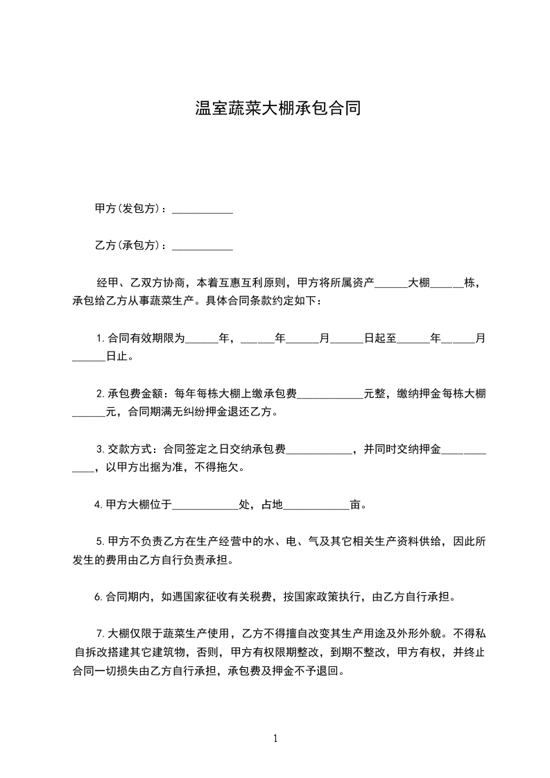7、乙方不得将所承包的大棚转包给他人经营,一经发现甲方将解除乙方承包权,合同终止,大棚回收,因此而造成的经济损失由乙方自行承担,承包费不予退回。