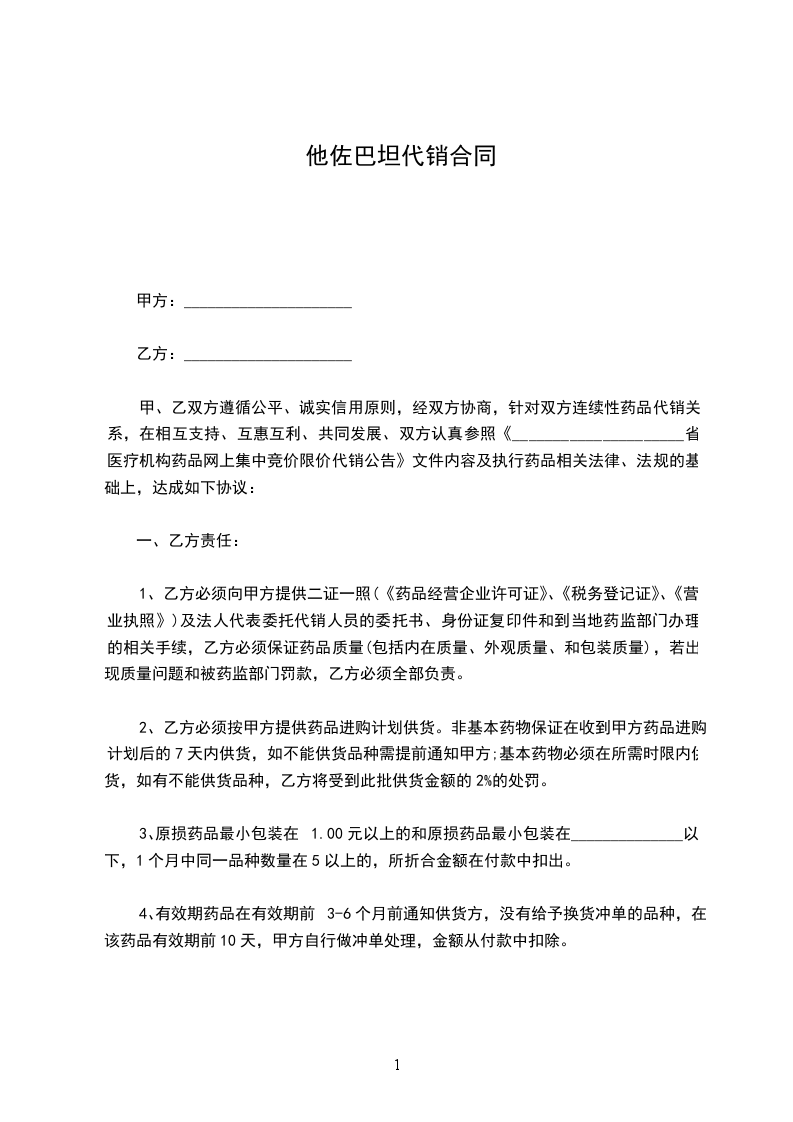 1、乙方必须向甲方提供二证一照(《药品经营企业许可证》、《税务登记证》、《营业执照》)及法人代表委托代销人员的委托书、身份证复印件和到当地药监部门办理的相关手续,乙方必须保证药品质量(包括内在质量、外观质量、和包装质量),若出现质量问题和被药监部门罚款,乙方必须全部负责。