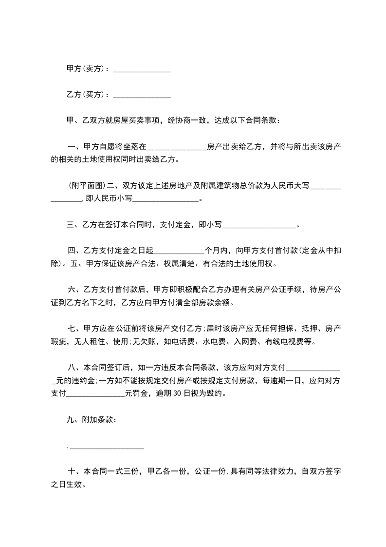 1、乙方应在签订《____房屋买卖合同》时,支付相当于总房款的三分之一的定金。