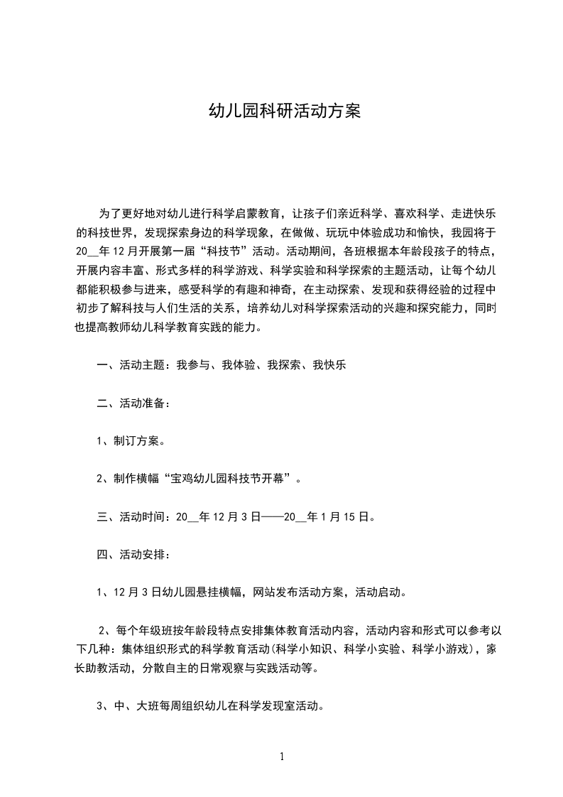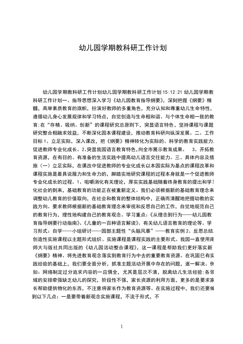 幼儿园学期教科研工作计划幼儿园学期教科研工作计划15:12:21幼儿园学期教科研工作计划一、指导思想深入学习《幼儿园教育指导纲要》,深刻把握《纲要》精髓,高举素质教育的旗帜,扮演好教师的多重角色,充分认知和尊重幼儿生命特性,遵循幼儿身心发展规律和学习特点,自觉创造与生命相和谐、与个体生命相一致的教育;在“存精、吸纳、创新”的课程研究总原则下,突显语言特色,坚持课程与课题研究整合相融求效益,不断深化园本课程建设,推动教育科研向纵深发展。二、工作目标1、立足实际,深入课改,把《纲要》精神转化为实际的、科学的教育实践能力,促进教师专业化成长。2、突显我园语言教育特色,向全市展示教育成果。3、开拓教育资源,在有目的、有准备的生活实践中提高幼儿语言交往能力。三、具体内容及措施(一)立足实际,在课改中促进教师的专业化成长以本园实际为基点的课程改革和课程实施是最具说服力和生命力的,脚踏实地研究课程的过程本身就是一个促进教师专业化成长的过程。1、咀嚼消化有关理论,厚实实践基础随着终身教育的提出和学习化社会的到来,基础教育的功能正在被重新定义。我们必须根据新的基础教育理念来调整幼儿教育的价值取向,在社会和教育的整体结构中,正确而清醒地把握幼教的实践方向。要求教师根据新的基础教育理念来审视和反思自己的工作,自觉地规范自己的教育行为,理性地构建自己的教育观念。学习重点:《从理念到行为——幼儿园教育指导纲要行动指南》、《儿童的一百种语言解读》、有关幼儿语言教育的理论等。学习形式:自学——小组研讨——园部主题性“头脑风暴”——教育实例2、反思总结,创造性实施课程以主题形式组织、实施课程是课程实践的主要形式。我园一直使用南师大与版社共同出版的《幼儿园活动整合课程》,这一课程是帮助我们更好落实新《纲要》精神、将先进教育观念落实到教育行为中去的重要教育资源。在巩固巳有实践经验的基础上,我们要全面分析,抓准主题活动开展中存在的问题,逐一解决。例如:网络制定过分追求内容的一应俱全,尤其是层次不清,脱离幼儿生活经验;各领域的安排牵强缺乏幼儿的探究,阶段性不强,家长资源的利用方面,更多的是要求家长帮助提供物化的东西,不注意将家长作为教育资源等。在实施过程中,我们还要做到以下几点:一是要带着新观念实施课程,不流于形式,不