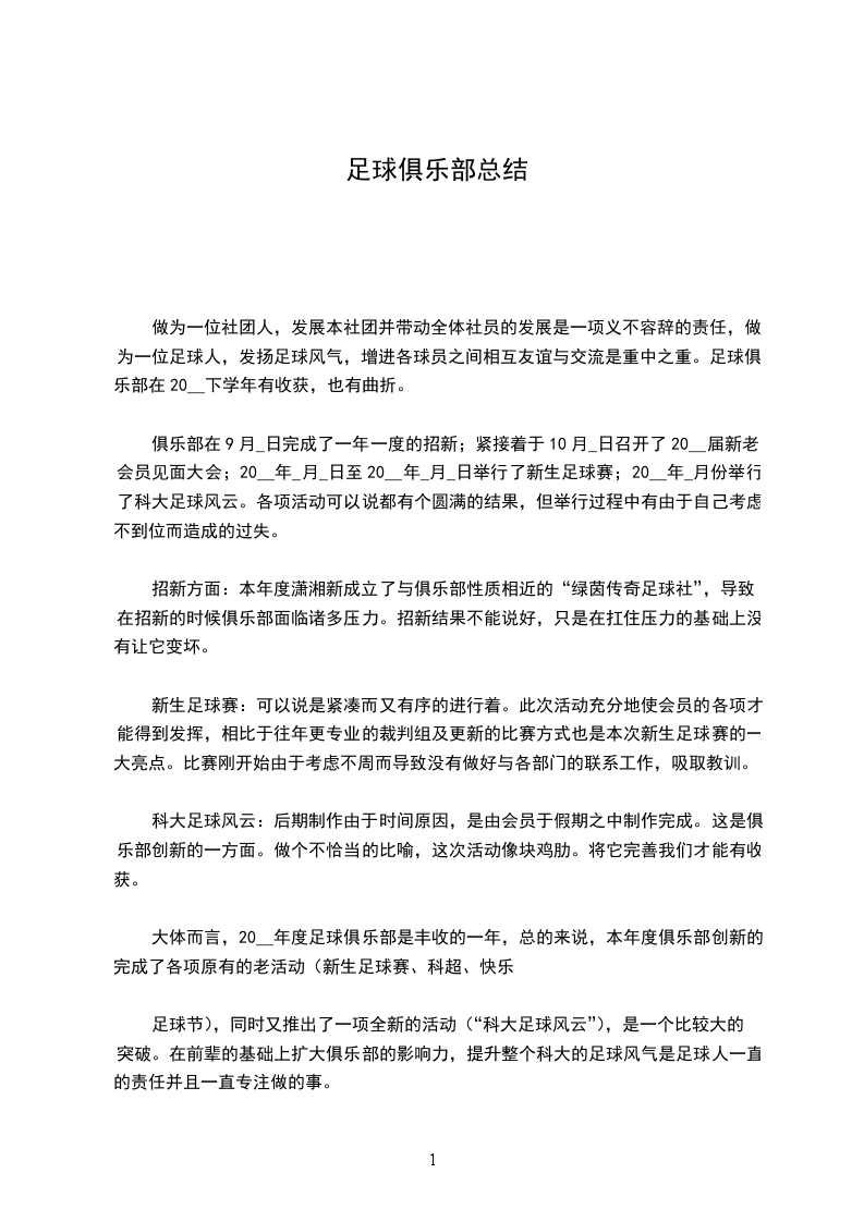 大体而言,20__年度足球俱乐部是丰收的一年,总的来说,本年度俱乐部创新的完成了各项原有的老活动(新生足球赛、科超、快乐