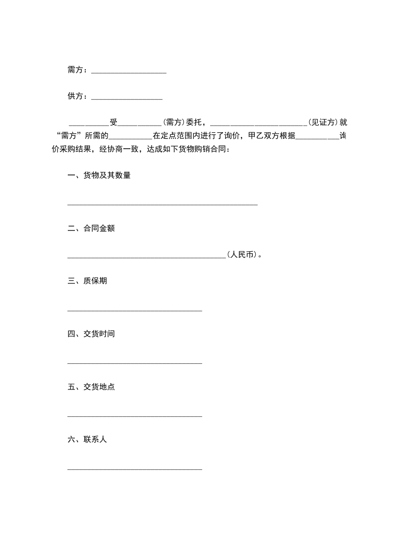 __________受___________(需方)委托,________________________(见证方)就“需方”所需的___________在定点范围内进行了询价,甲乙双方根据___________询价采购结果,经协商一致,达成如下货物购销合同: