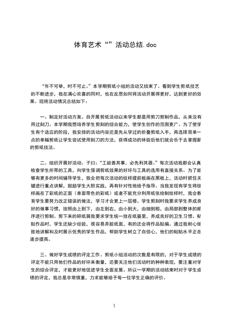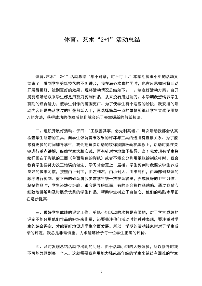 本学期学校组织开展体育艺术“2+1”活动。我认真选取活动内容,在活动中加强指导与监督,尽量使不同程度的学生都有所收获。我以课堂为依托,扎实地开展好体育艺术2+1的研究工作。从传统文化素材的选择,在教学中的巧妙设计,到课堂教学中的具体实施,以及课后的及时反省与记录,我都特别用心,所以积累了一些好的经验,也充分感悟到了传统文化对于美术教学的独特作用。今后的努力方向: