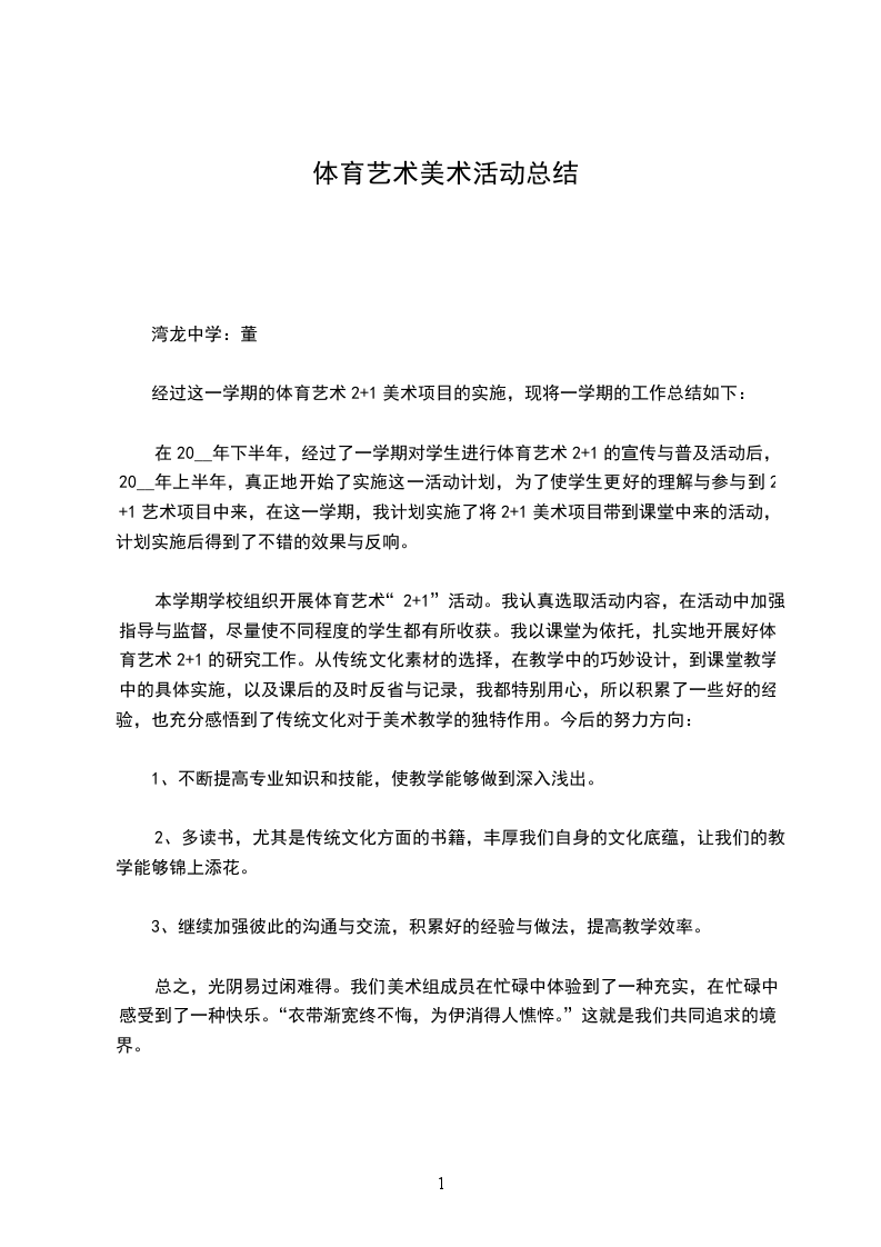 在20__年下半年,经过了一学期对学生进行体育艺术2+1的宣传与普及活动后,20__年上半年,真正地开始了实施这一活动计划,为了使学生更好的理解与参与到2+1艺术项目中来,在这一学期,我计划实施了将2+1美术项目带到课堂中来的活动,计划实施后得到了不错的效果与反响。