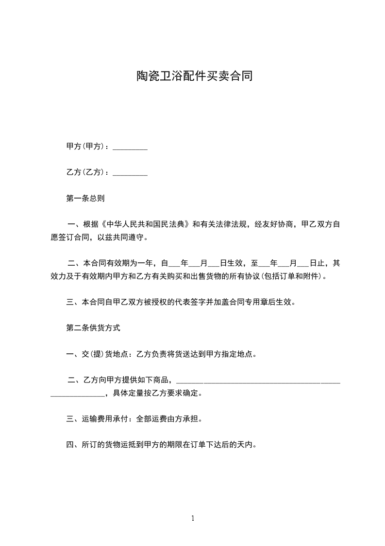 四、交货及退货:________月________日前交货并安装完毕,退货产品表面无污损,无渗水,至购货期开始________个工作日内方可退货。
