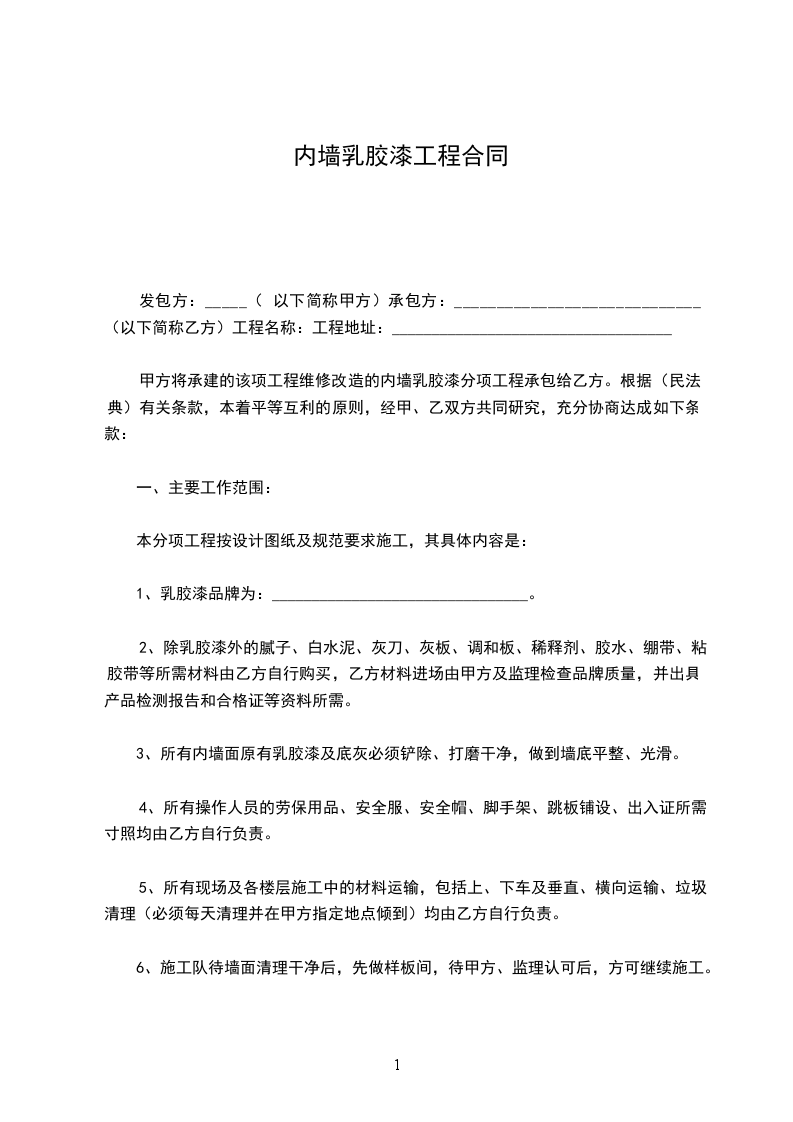 甲方将承建的该项工程维修改造的内墙乳胶漆分项工程承包给乙方。根据(民法典)有关条款,本着平等互利的原则,经甲、乙双方共同研究,充分协商达成如下条款: