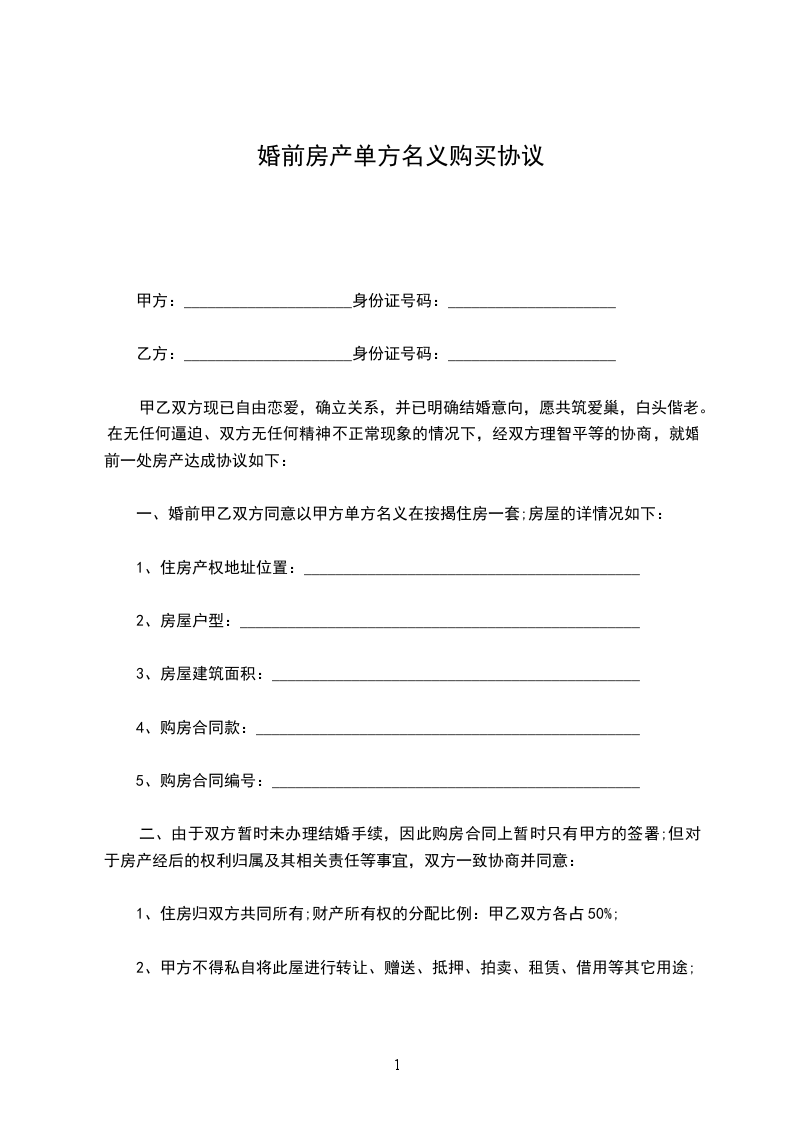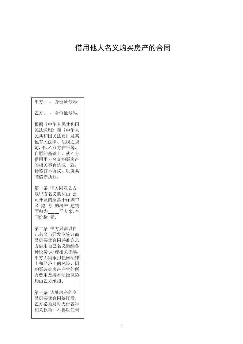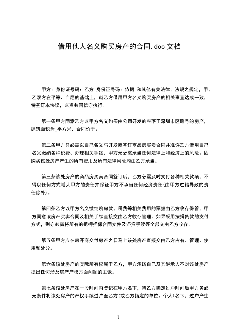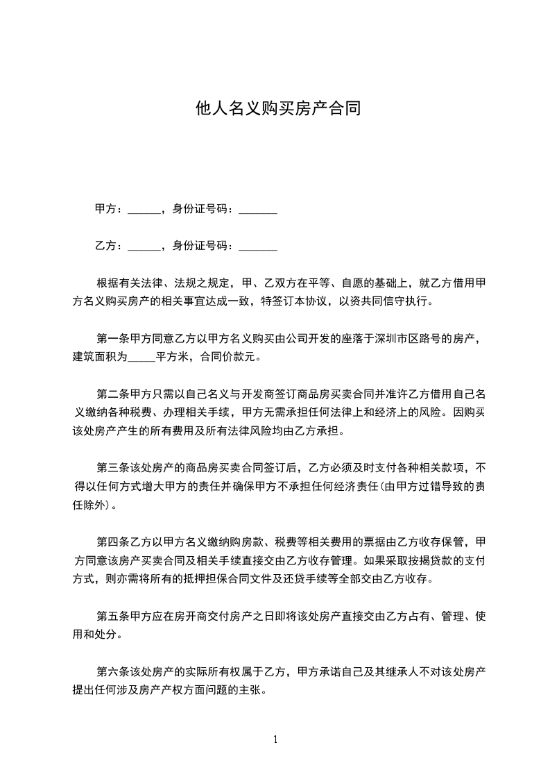 第一条 甲方同意乙方以甲方名义购买由 公司开发的座落于深圳市 区 路 号 的房产,建筑面积为_____平方米,合同价款 元。