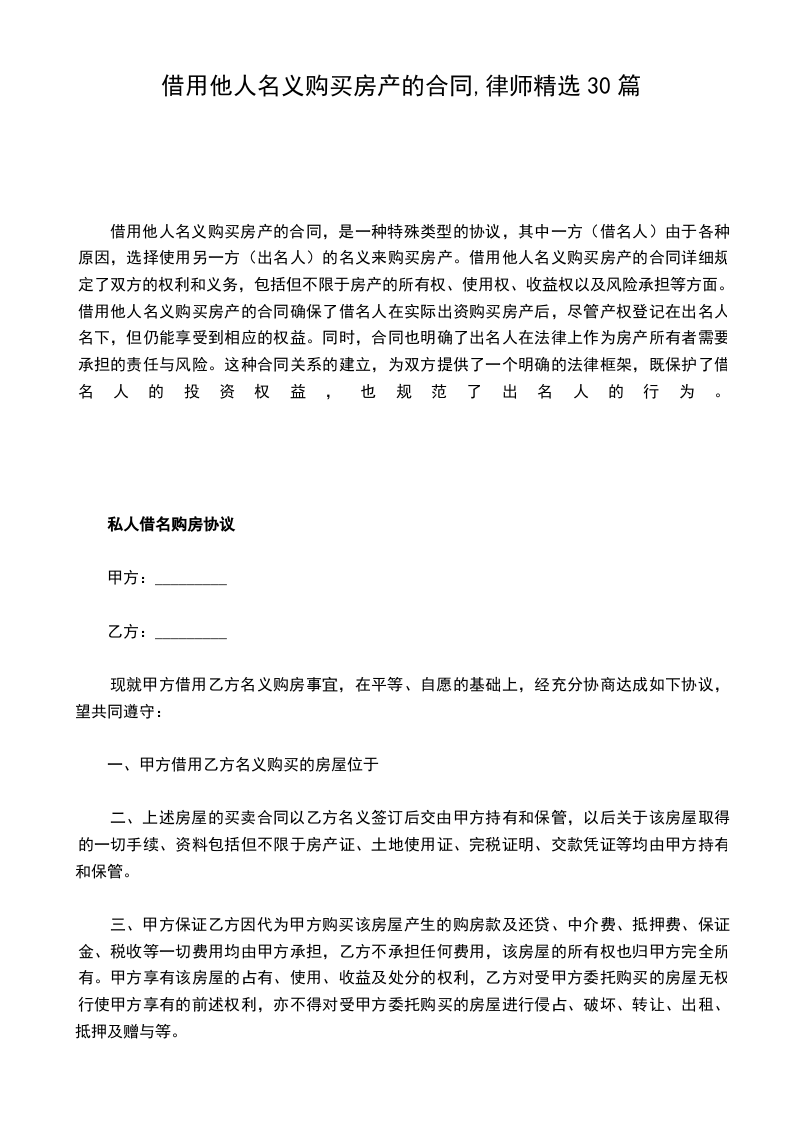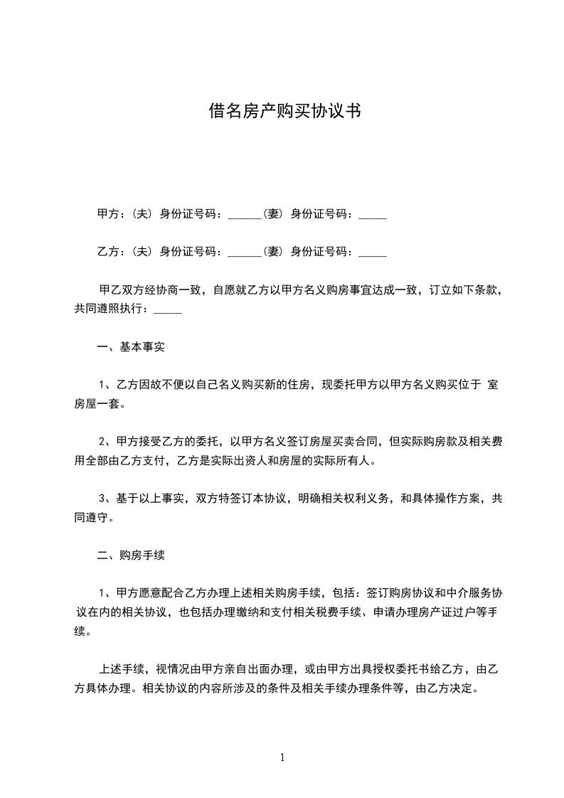 根据《中华人民共和国民法典》及其他有关法律、法规之规定,甲、乙双方在平等、自愿的基础上,就乙方借用甲方名义购买房产的相关事宜达成一致,特签订本协议,以资共同信守执行。
