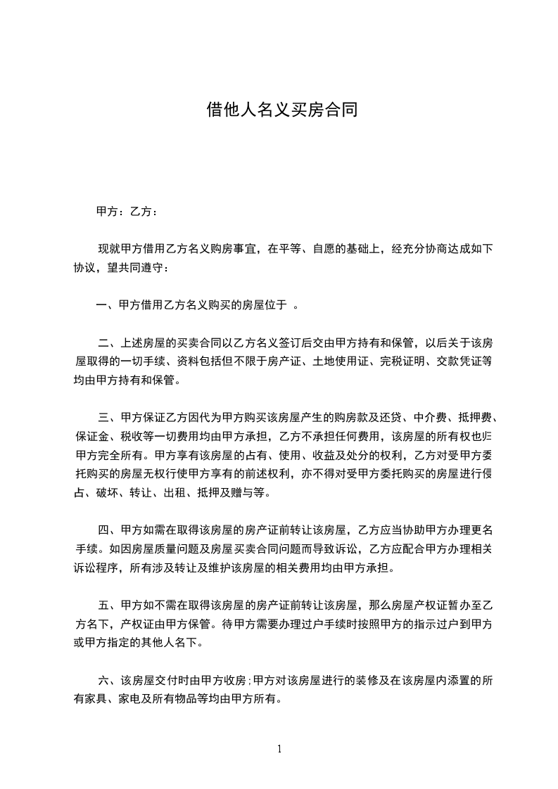 第二条 甲方只需以自己名义与开发商签订商品房买卖合同并准许乙方借用自己名义缴纳各种税费、办理相关手续,甲方无需承担任何法律上和经济上的风险。因购买该处房产产生的所有费用及所有法律风险均由乙方承担。