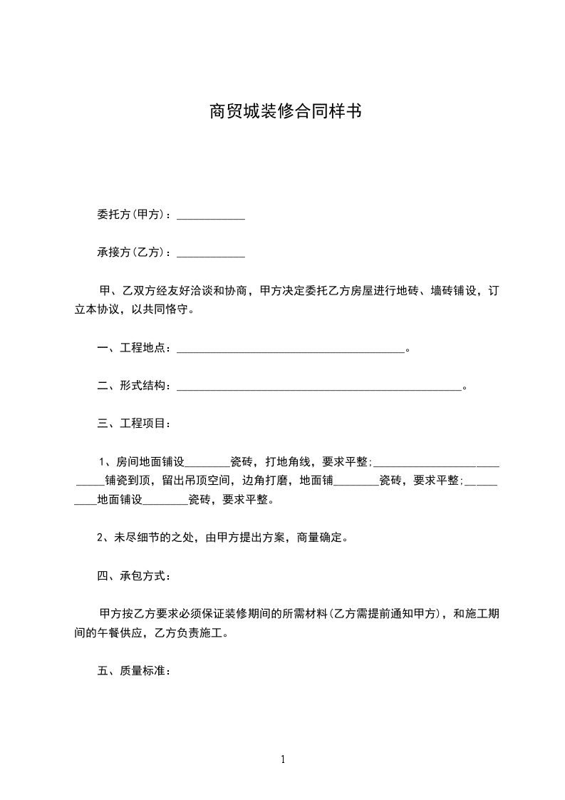 1、房间地面铺设________瓷砖,打地角线,要求平整;___________________________铺瓷到顶,留出吊顶空间,边角打磨,地面铺________瓷砖,要求平整;__________地面铺设________瓷砖,要求平整。