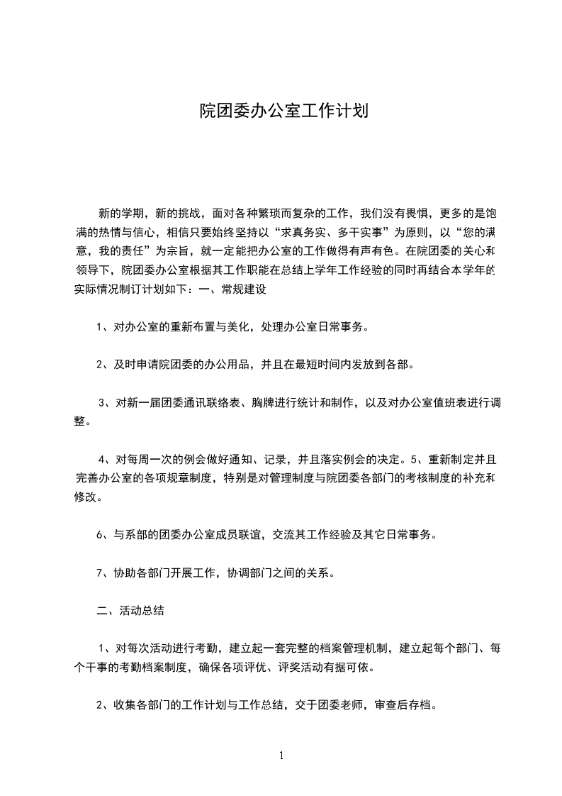 新的学期,新的挑战,面对各种繁琐而复杂的工作,我们没有畏惧,更多的是饱满的热情与信心,相信只要始终坚持以“求真务实、多干实事”为原则,以“您的满意,我的责任”为宗旨,就一定能把办公室的工作做得有声有色。在院团委的关心和领导下,院团委办公室根据其工作职能在总结上学年工作经验的同时再结合本学年的实际情况制订计划如下:一、常规建设