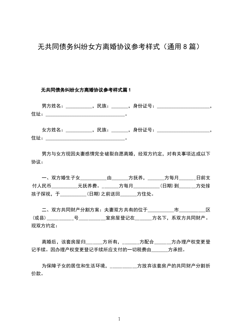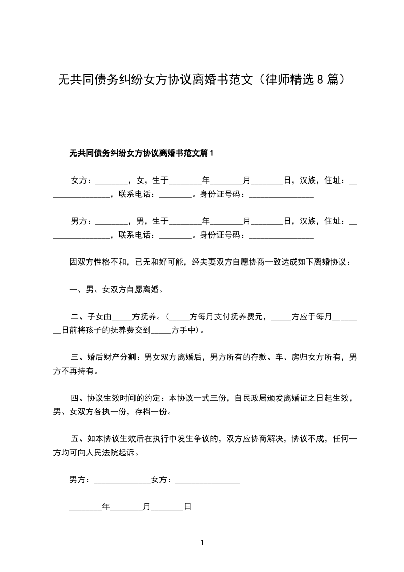 无共同债务纠纷女方协议离婚书参考格式篇8