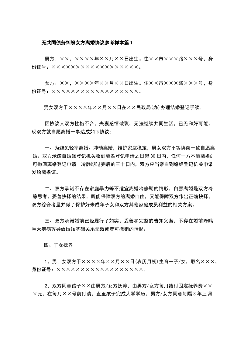 无共同债务纠纷女方协议离婚书参考格式篇3