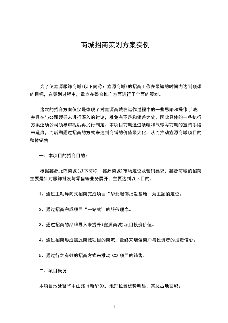 这次的招商方案仅仅是体现了对鑫源商城在运作过程中的一些思路和操作手法,并且在与公司领导未进行深入的讨论,难免有不足和偏差之处,因此具体的一些执行方案还须公司领导审视后再另行制定。本项目前期通过条幅和气球等前期的宣传手段来造势,而后期通过招商的方式来达到商铺的价值最大化,从而推动鑫源商城项目的整体销售。