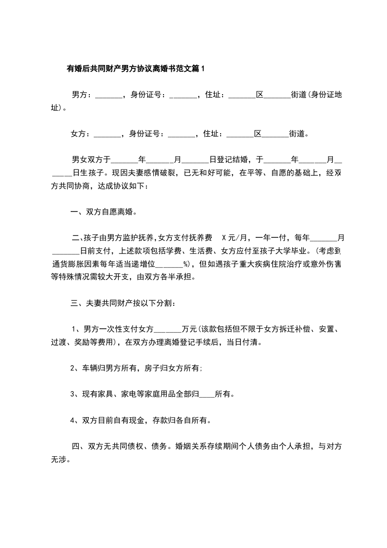 有婚后共同财产男方协议离婚书范文篇5