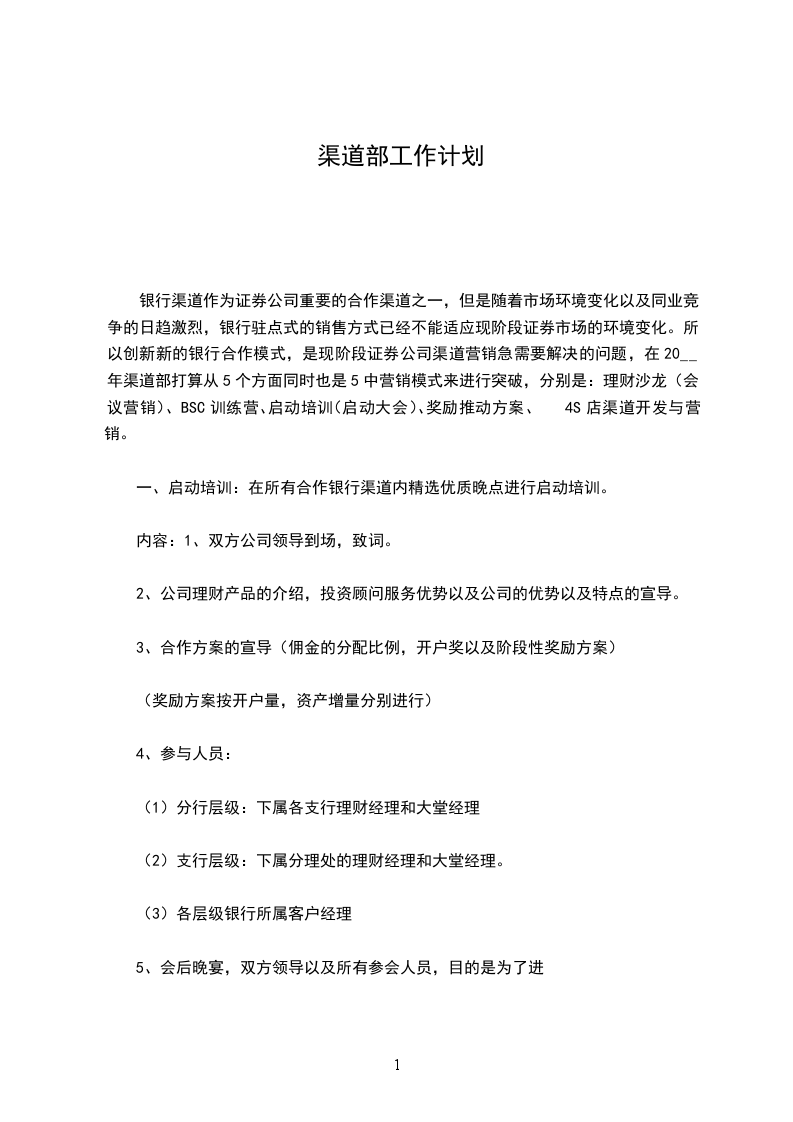 银行渠道作为证券公司重要的合作渠道之一,但是随着市场环境变化以及同业竞争的日趋激烈,银行驻点式的销售方式已经不能适应现阶段证券市场的环境变化。所以创新新的银行合作模式,是现阶段证券公司渠道营销急需要解决的问题,在20__年渠道部打算从5个方面同时也是5中营销模式来进行突破,分别是:理财沙龙(会议营销)、BSC训练营、启动培训(启动大会)、奖励推动方案、4S店渠道开发与营销。