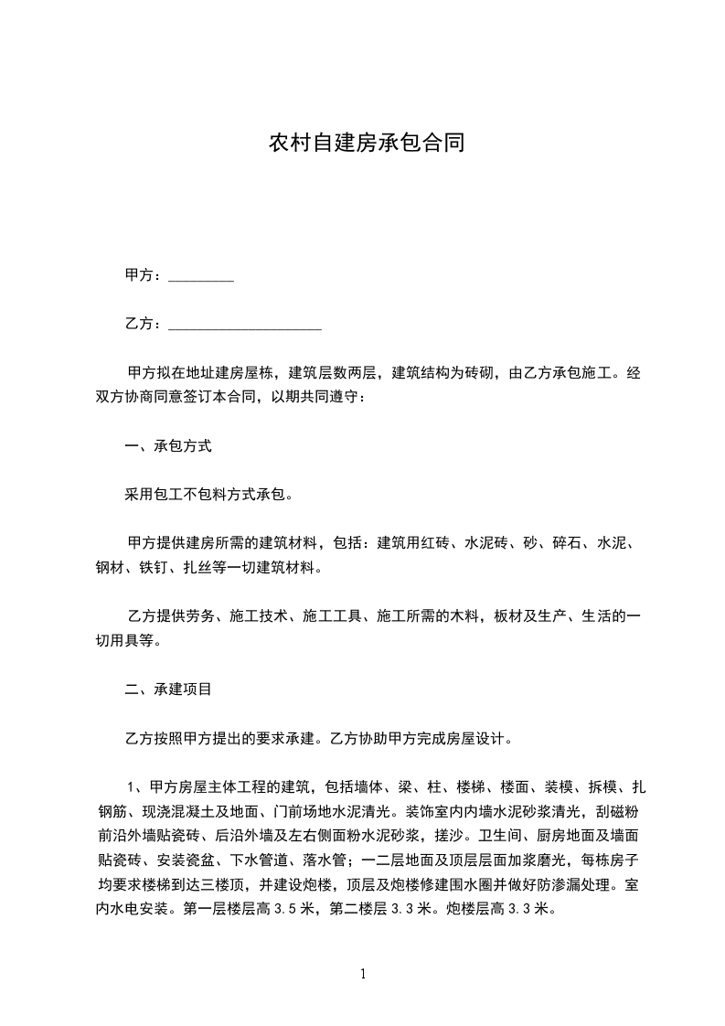 甲方拟在地址建房屋栋,建筑层数两层,建筑结构为砖砌,由乙方承包施工。经双方协商同意签订本合同,以期共同遵守: