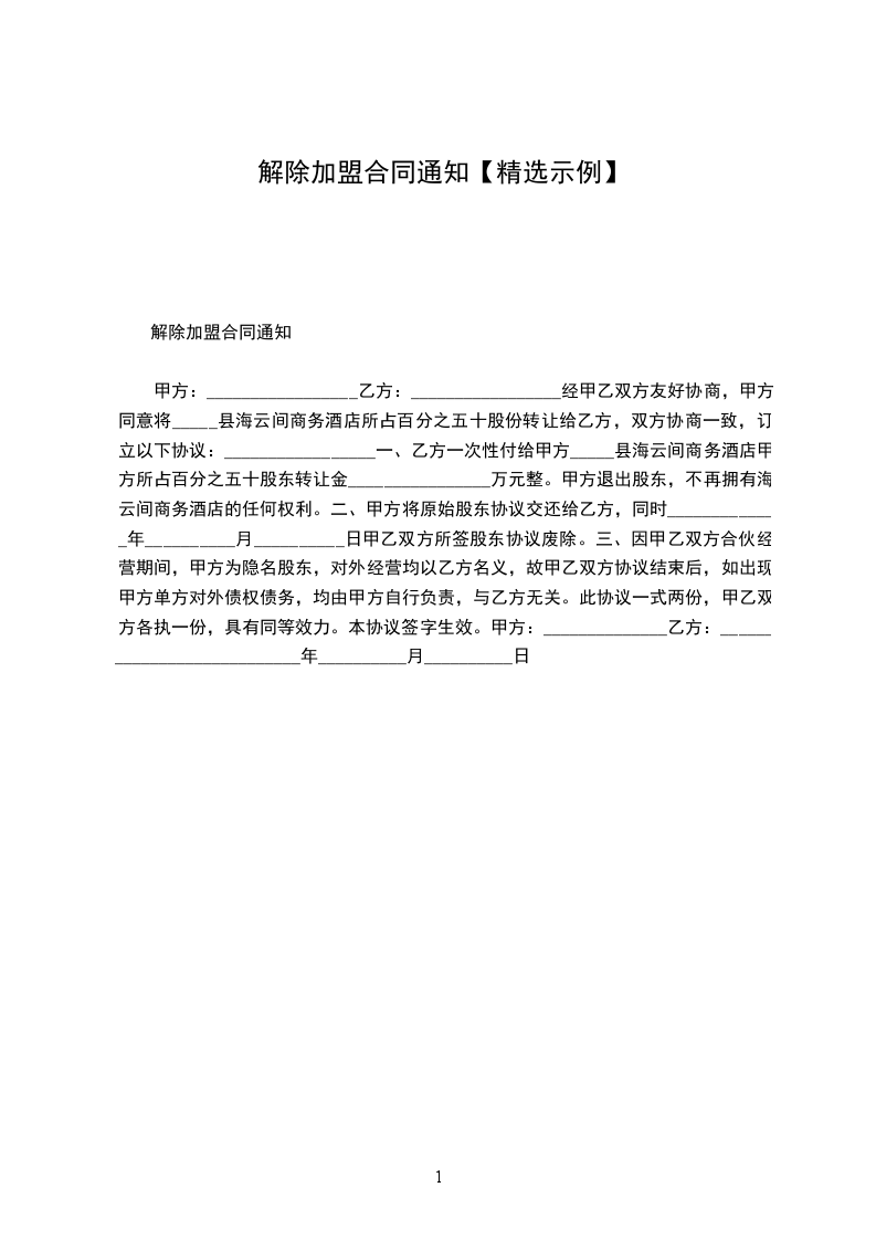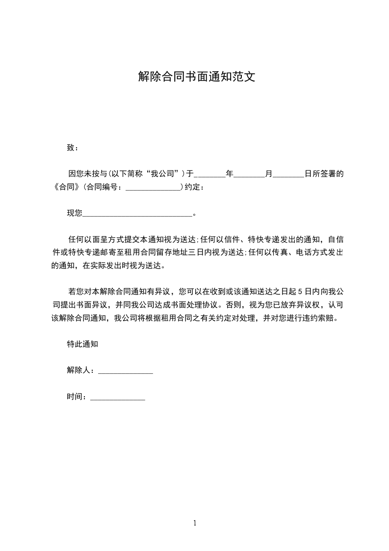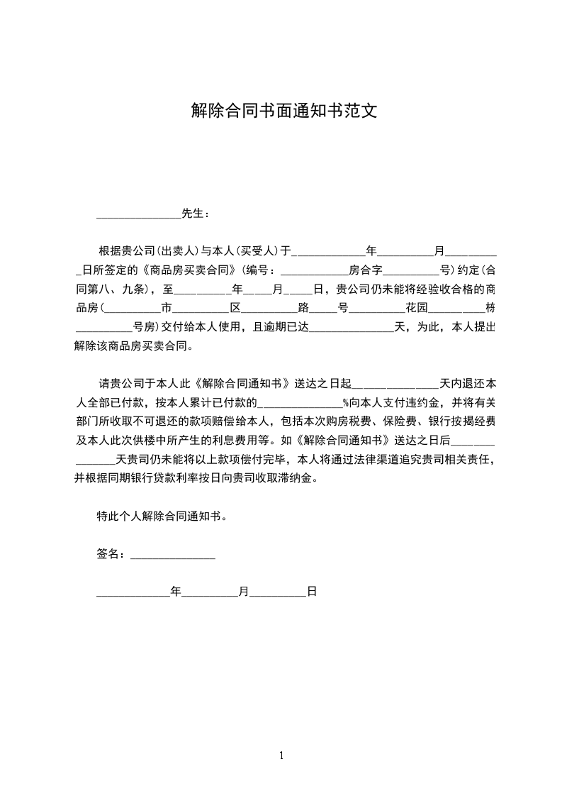 您逾期支付合同约定购房款款人民币【】元已超过【】日。鉴 上述情况,您已构成违约并符合我司解除合同的条件。我司现书面通知您,从即日起我司与您解除买卖合同。请您尽快与我司联系并到指定地点办理相关手续(若您在收到此通知前已办妥逾期购房款支付手续,则可不需理会此通知书)。