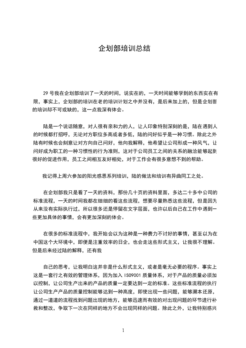 在企划部我只是看了一天的资料,那份几十页的资料里面,多达二十多中公司的标准流程,一天的时间我都在细细的看这些流程,想要尽量熟悉这些流程,但是因为从来没有实际执行过,所以很多还是停留在文字层面,也许以后自己在工作中遇到一些更加具体的事情,会有更加深刻的体会。