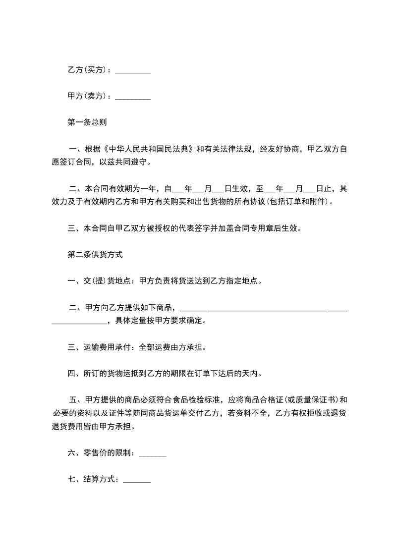 二、甲方向乙方提供如下商品,________________________________________________________,具体定量按甲方要求确定。
